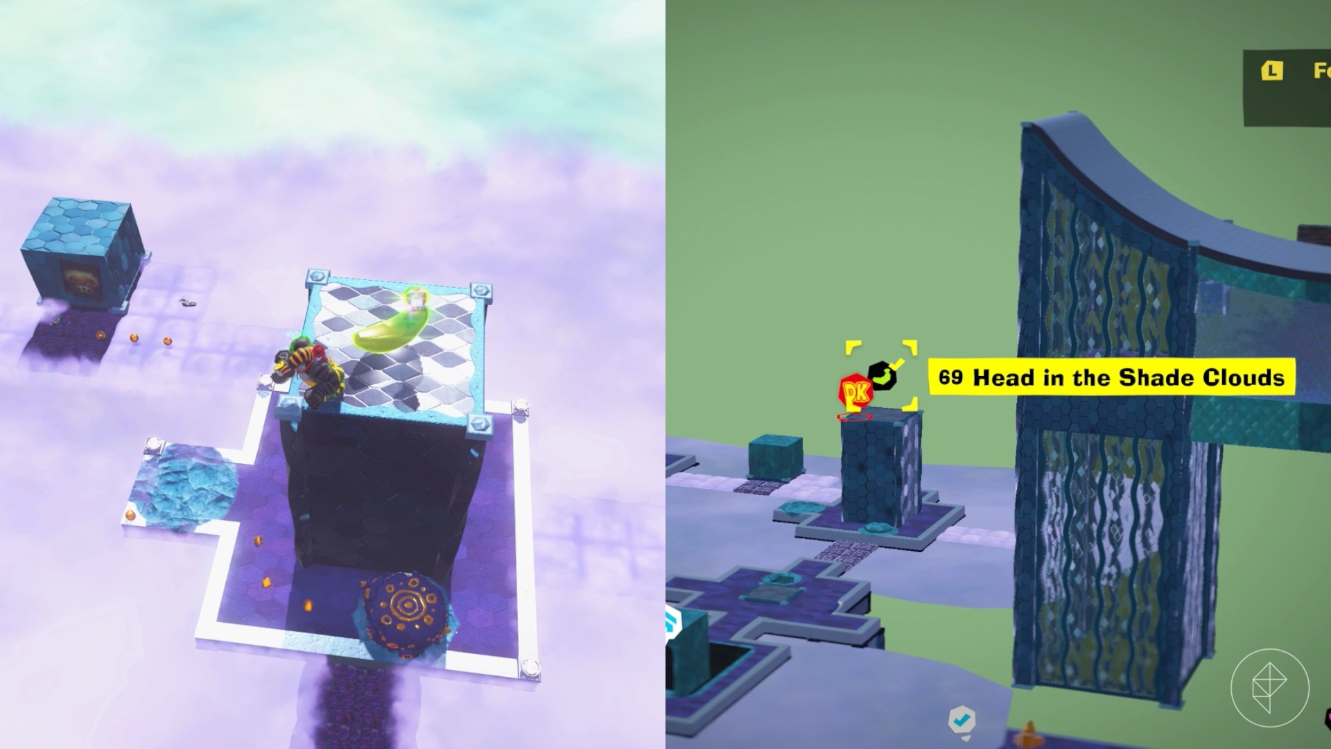 Use Snake Bananza to charge jump up to the climbable part of the second tower among the shaded clouds. From the climbable part, charge jump again up on top of the tower and punch the light door down to drop directly on this banana.
