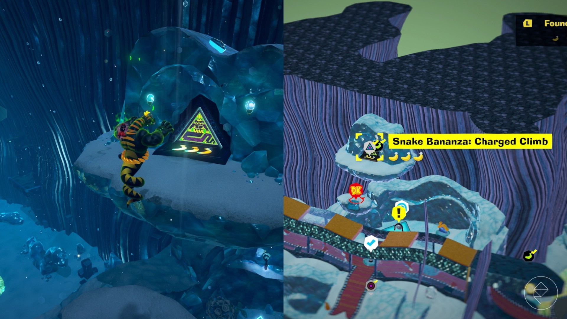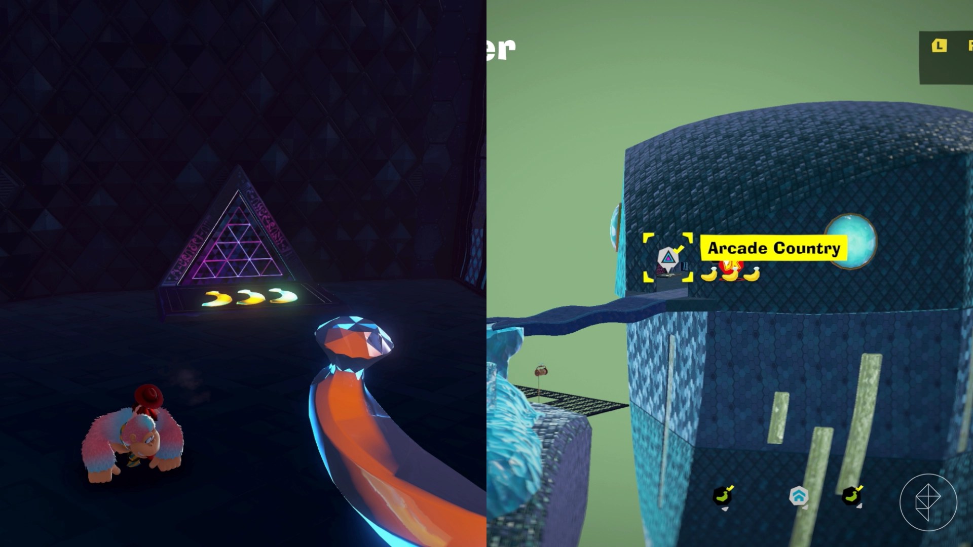 After you’ve turned on the synthetic sun, drop down to the bottom of the Sculptors’ Studio to find the lit up door. Head inside to find a shifty triangle, but before you start, make sure to fill up your bananergy by hitting the nearby melon. Transform into your snake form and hit the challenge to start it. Charge jump your way to the top and destroy the block to get your banana.