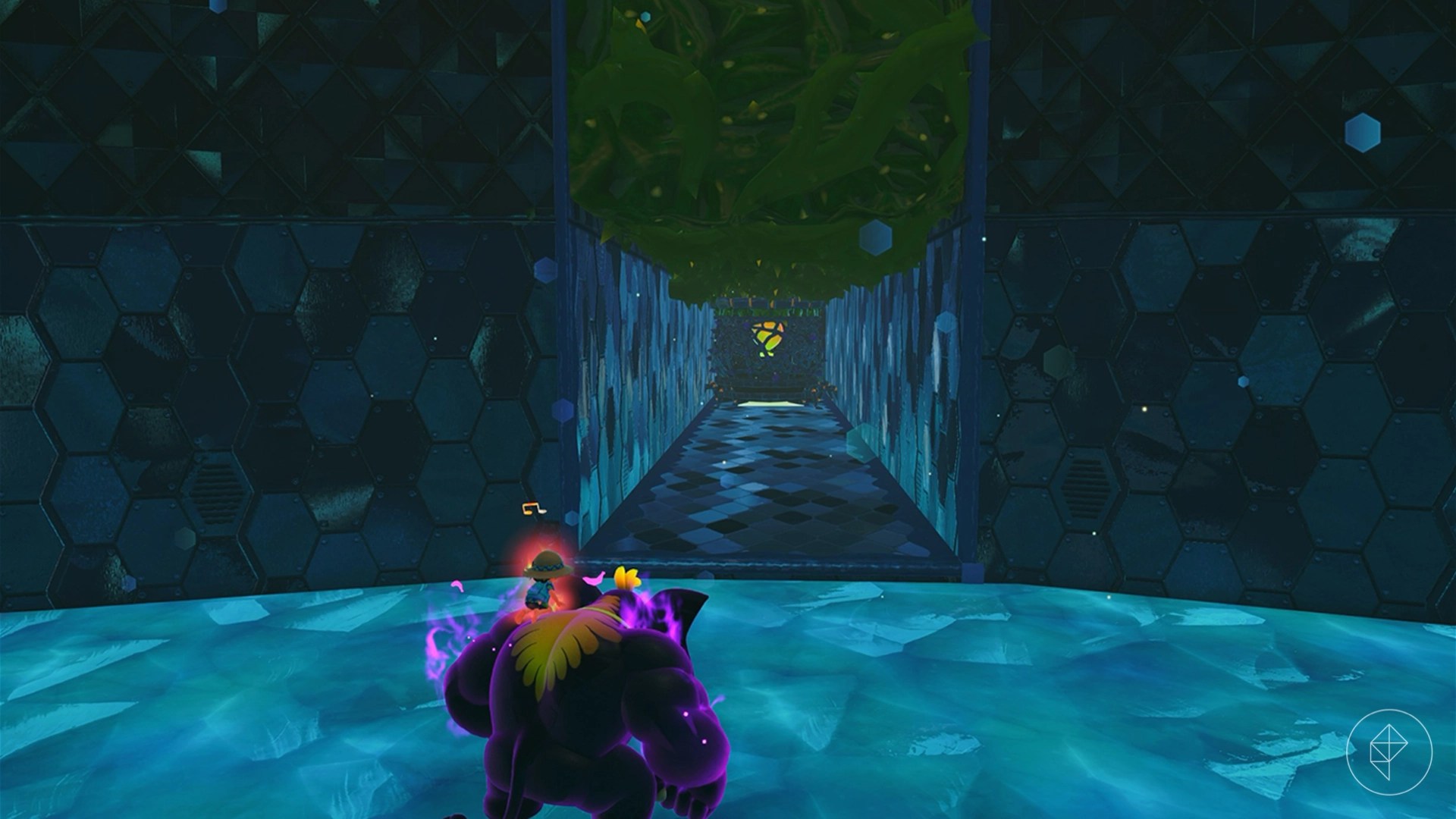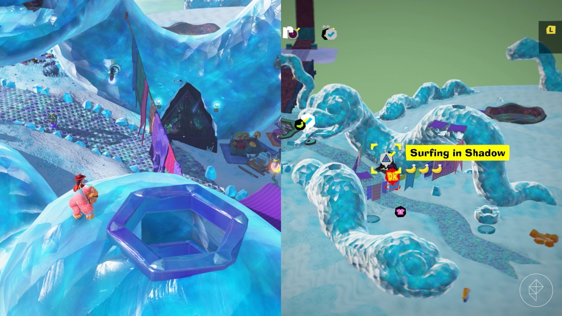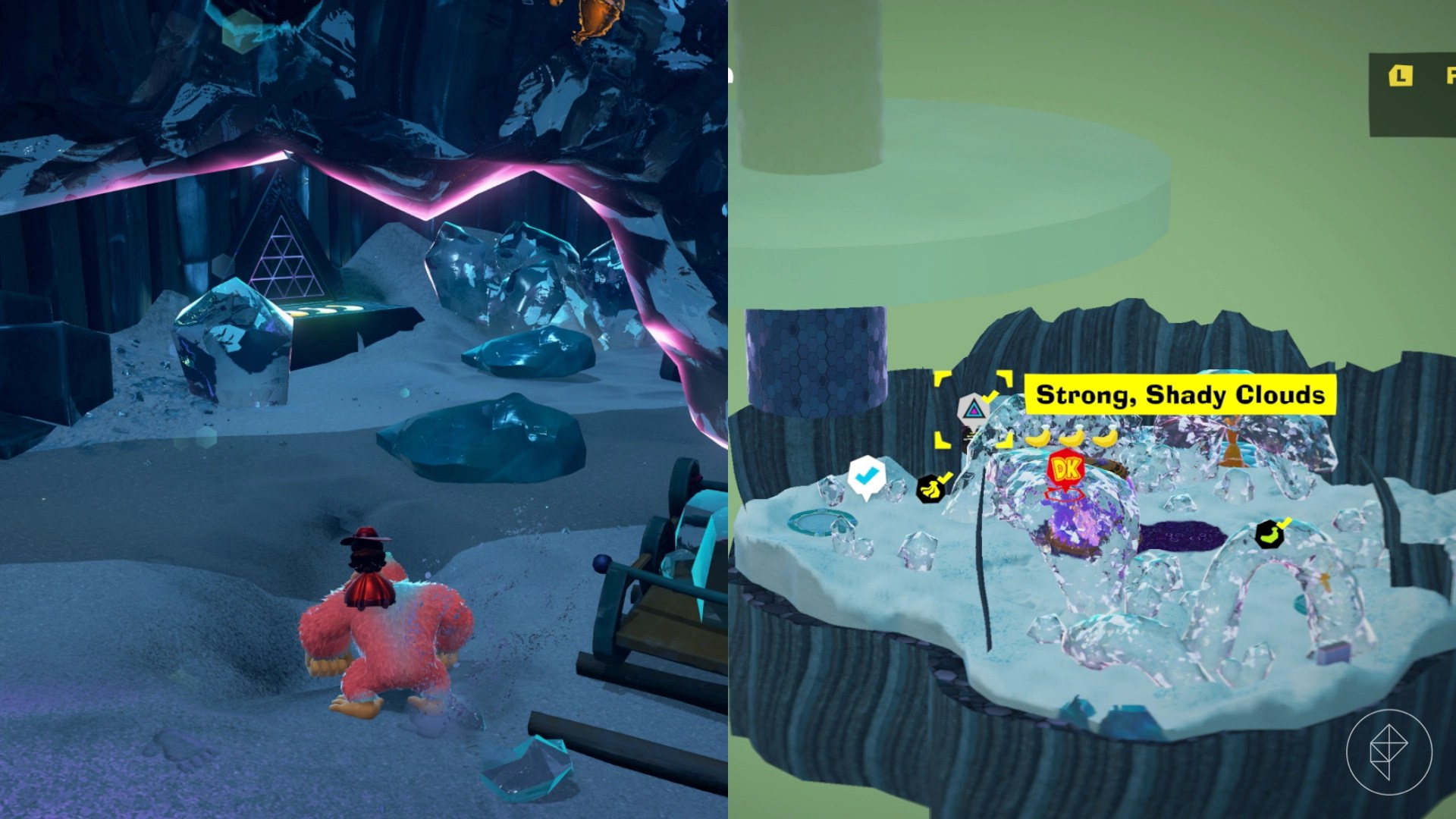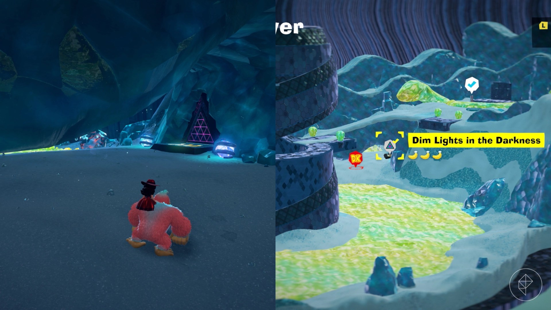 Break open the cracked wall to find and complete this combat challenge for your banana. You’ll need to defeat five crockoids that have to be exposed to light first to win.