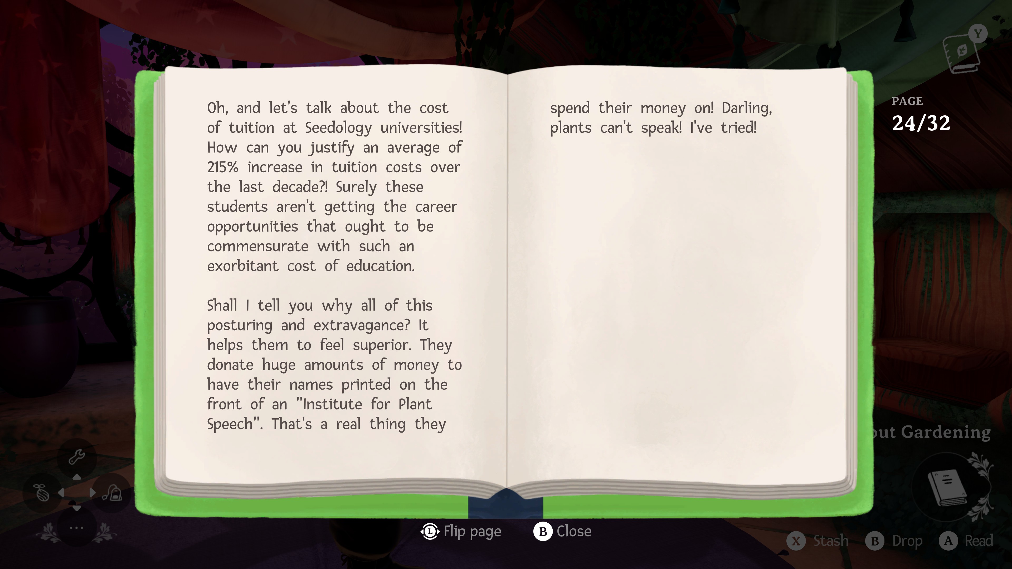 We already had the idea in mind of there being books that you can find and flip through if you want. This was a part of the game’s general direction of providing the player with intrinsically-motivated gameplay that lets you take things at the pace you want and “waste time” on idle tasks at your leisure. When it came to deciding what to actually write for these books, early on I knew that if we wanted our players to actually read these books, our best bet would be comedy. I think a lot of players have come to expect books in video games to contain lengthy (sometimes quite dry) exposition dumps of lore or backstory, so it felt like a fun surprise to give the player books that were totally optional and extremely lighthearted.