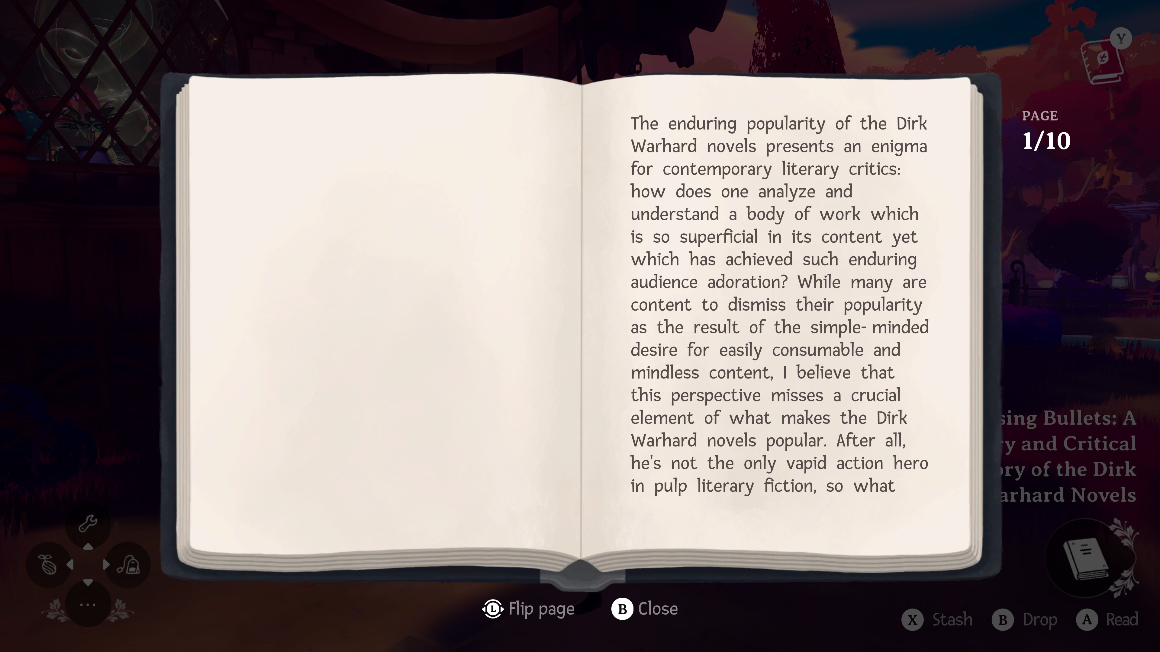 Books aren’t a contradiction of or a distraction from the adventure; they’re of a piece. What better way to force the player to stop pursuing goals than to hand them a serialized novella that has nothing to do with our hero’s journey?