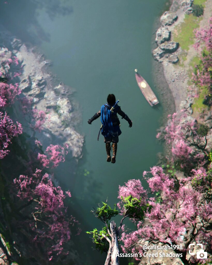 calisarah1998 shares Naoe leaping off a tree into a lake in Assassin’s Creed Shadows