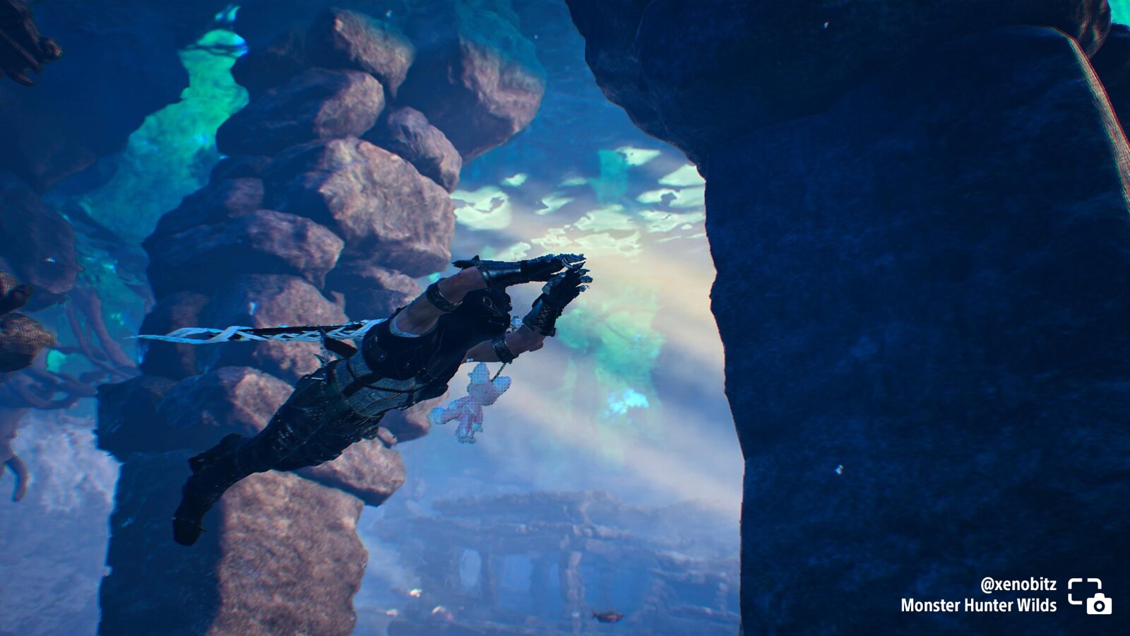 xenobitz shares a hunter wearing a Palico helmet underwater in Monster Hunter Wilds.