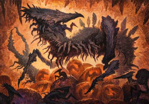 Slivers draw inspiration from the sci-fi trope of a swarm of alien creatures linked by a hive mind, similar to the Tyranids in the Warhammer 40k universe. In Magic: The Gathering lore, this species’ origins are still shrouded in mystery. They appeared on an unnamed plane where they were used as beasts of burden due to their ability to adapt and evolve for specific functions. However, evolution can’t be stopped or tamed, so the hidden queen of slivers, the Gravemother, orchestrated the rise of her species and their takeover of the world. Some time later, the Evincar of Rath, Volrath, visited another plane overrun by slivers and took some specimens, along with a Sliver Queen, away to serve him and his Phyrexian masters’ plans to invade Dominaria.
