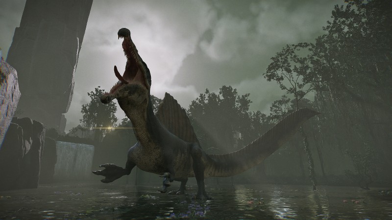 Jones says players can expect to fight mostly dinosaurs, but there are also human enemies, human-hybrid-dinosaur foes, and more. In my preview, I saw hostile alligators, snakes, raptors, and a passive brachiosaurus (that will turn hostile if you attack it). Players can expect t-rex enemies and other dinosaur classics like the spitting dilophosaurus that paints the screen with black effects and the spiky ankylosaurus. Players will have to handle Turok-style platforming over wooden docks, rocks jutting out of the ground, traps, and more. A laser lasso that acts as a grappling hook aims to make movement even more dynamic in combat and when platforming.