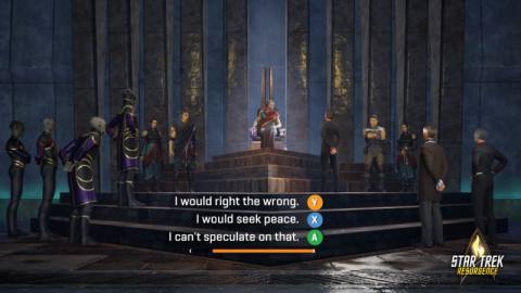 The Queen grills Jara, probing her with questions such as my feelings on the Kobloid’s less-than-stellar history with the Alydian’s and how I’d address that. While I tried to be as neutral as possible – as far as I was concerned, we’re attending to tackle our own problems, not to take on someone else’s – being put on the spot gets trickier when diplomatic answers disappear, and you must make a hard choice on who to side with. In Jara’s case, I had to declare which race the Federation should support in this trade dispute. This scene’s tension felt effective thanks to the solid performances on display. Spock’s new voice actor, in particular, seemed like a respectable replacement for the late Leonard Nimoy.