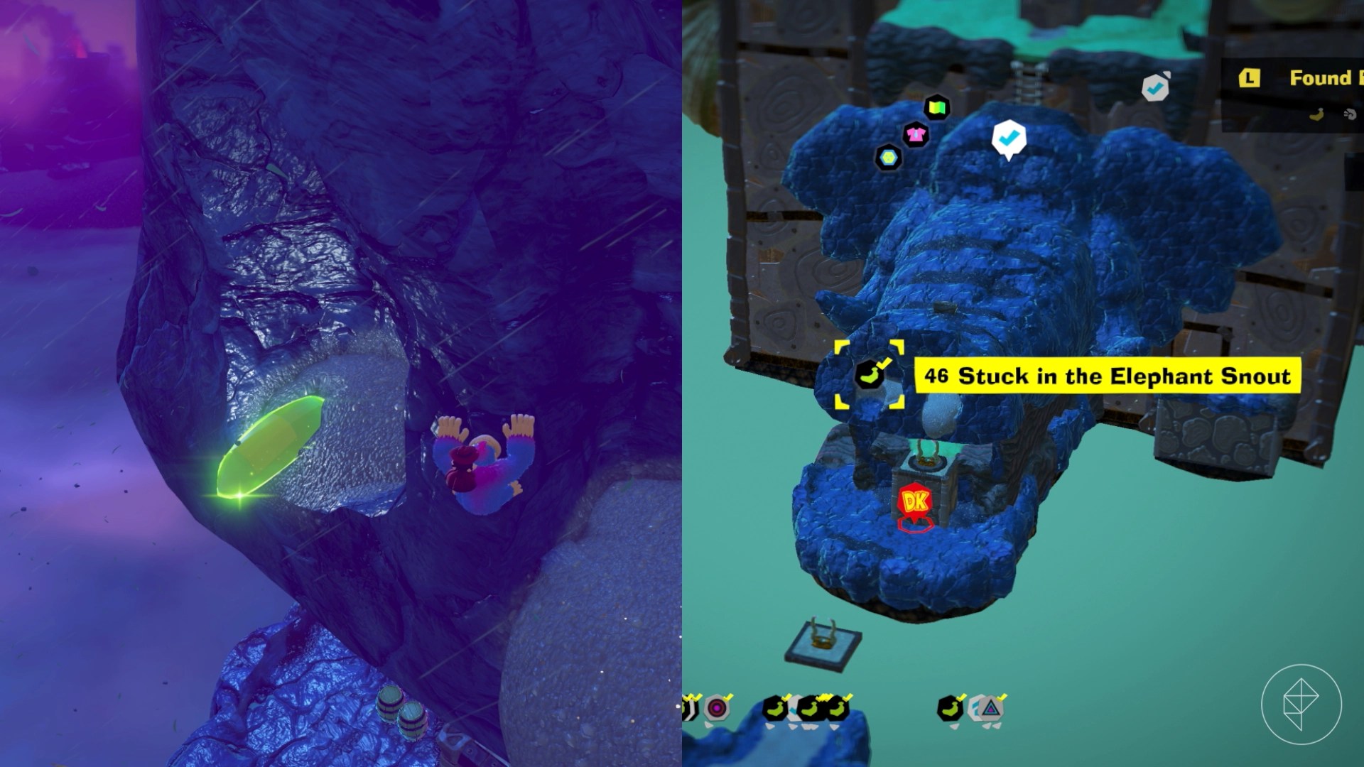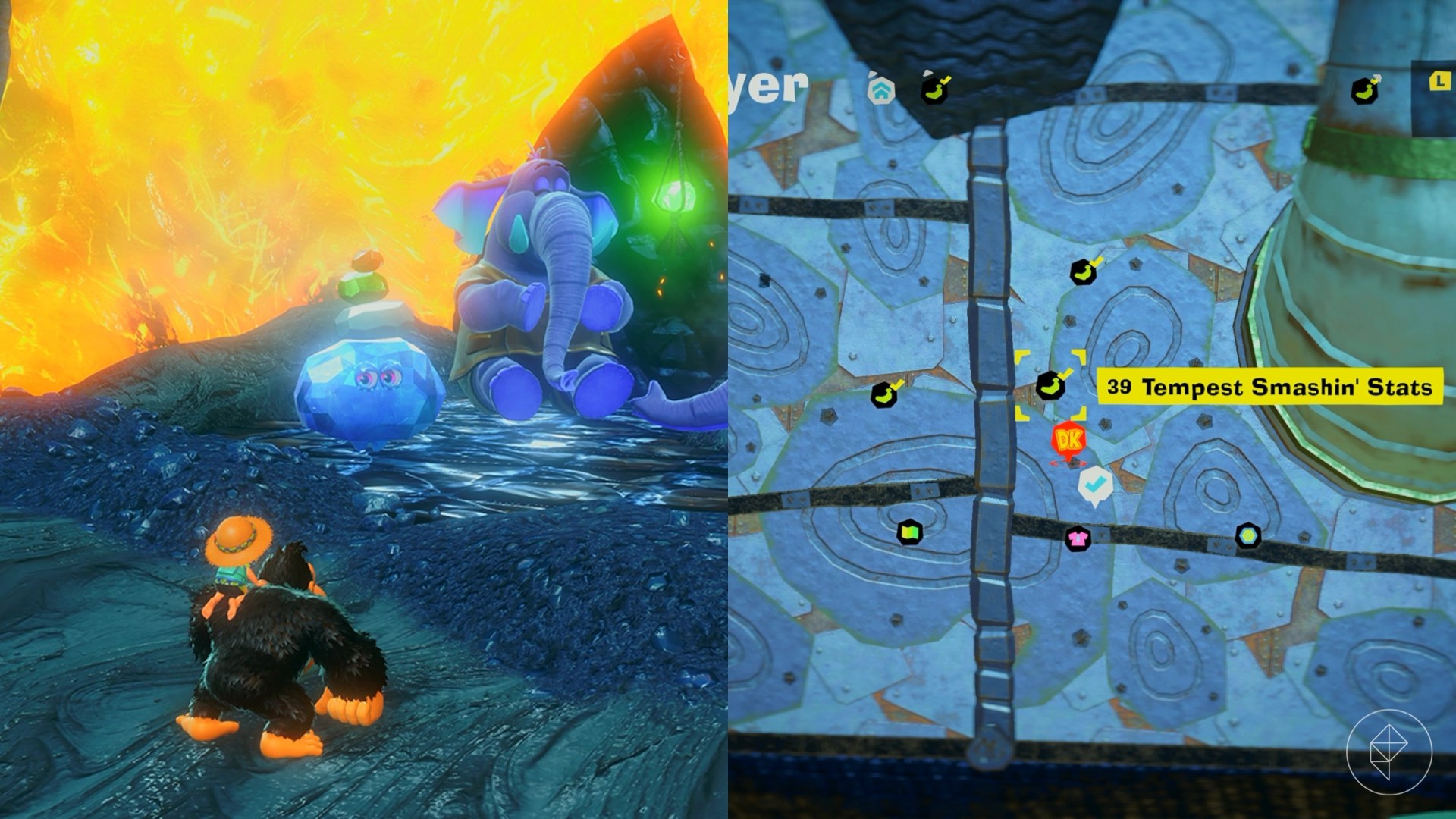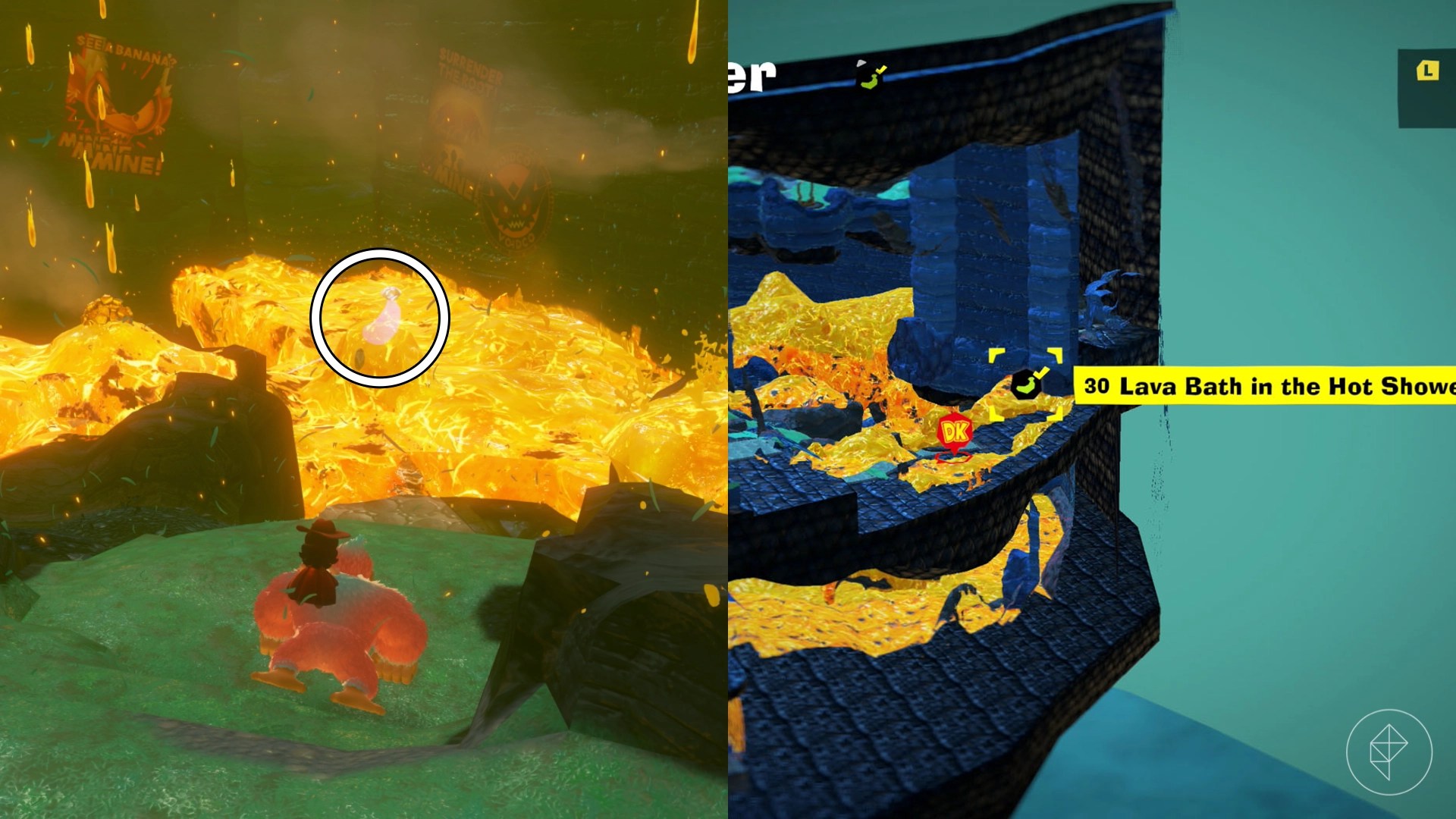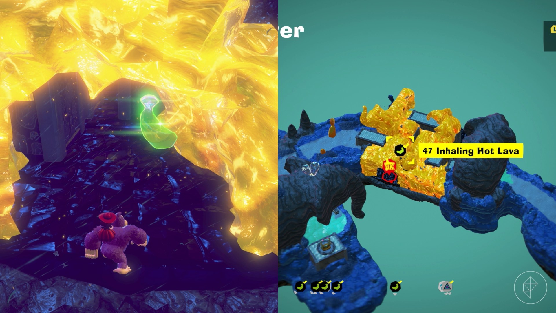Use a combination of DK’s Hand Slap with Elephant Bananza’s inhaling to get rid of the lava and scout out this banana that’s buried underneath. Be careful as you navigate around this maze, as the camera angles can get kind of wonky.