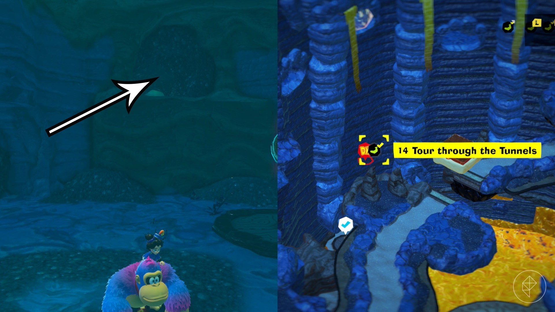 If you use DK’s Hand Slap, you should be able to see this banana underground ahead of the Big-Roof Shelter tuning fork. Dig straight down in front of the nearby sign to drop on this banana underground.