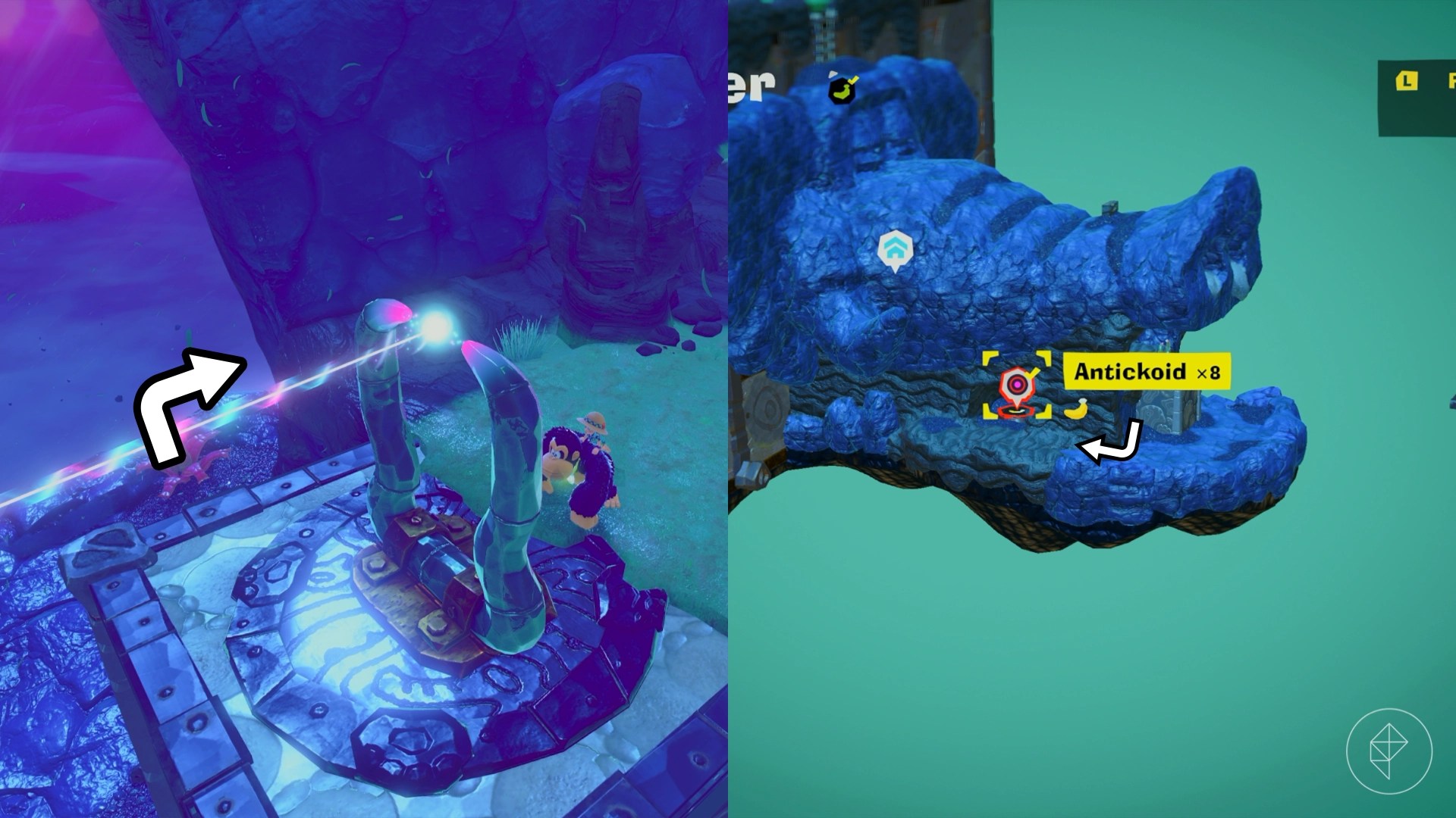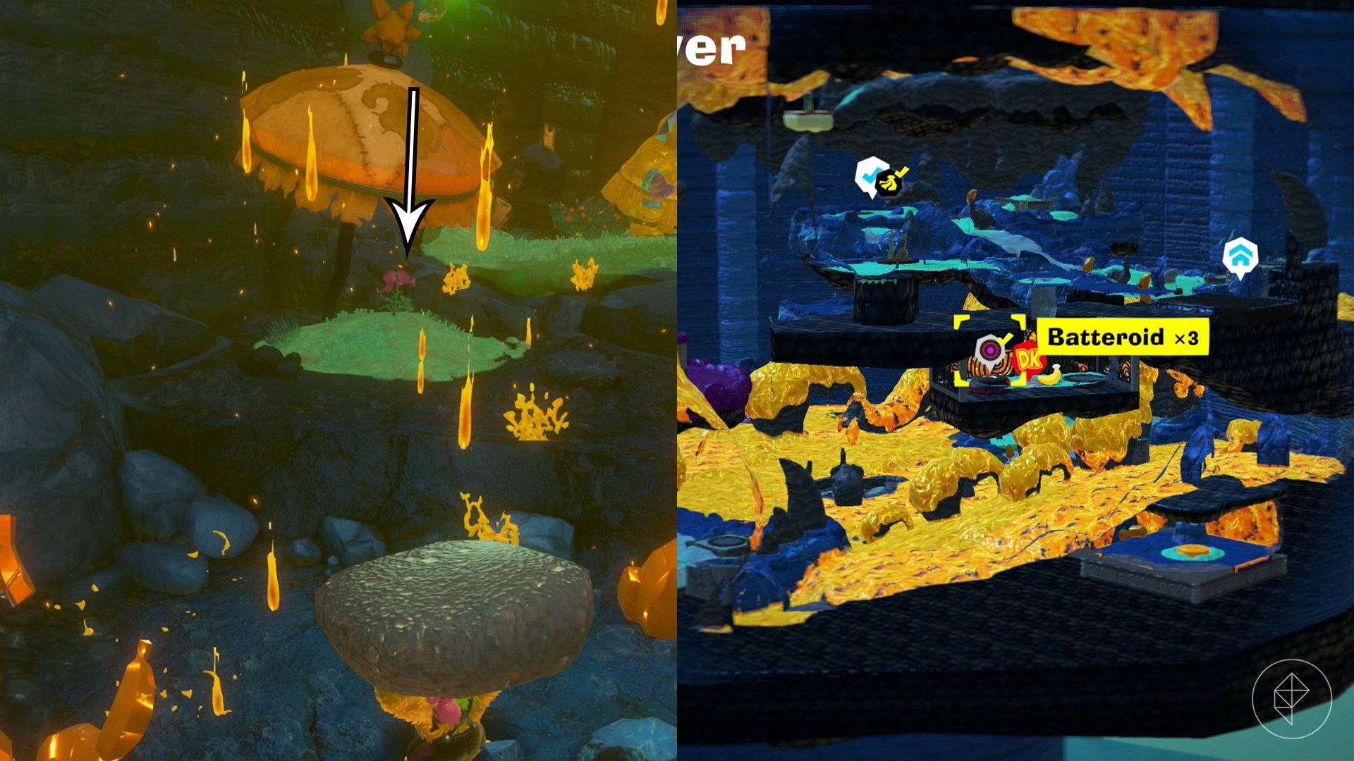 Before you ride the first zipline out of the Jumbo Spa, hop down and walk around the right corner to find the entrance to the battle challenge. Defeat the eight antickoids inside by lifting and dropping the goo glue platforms.