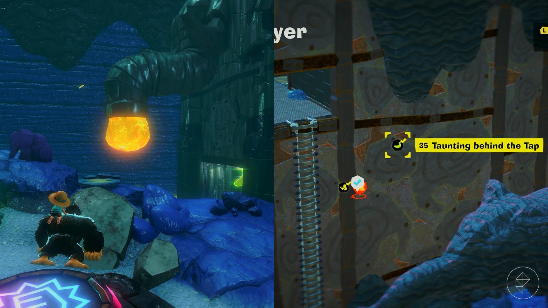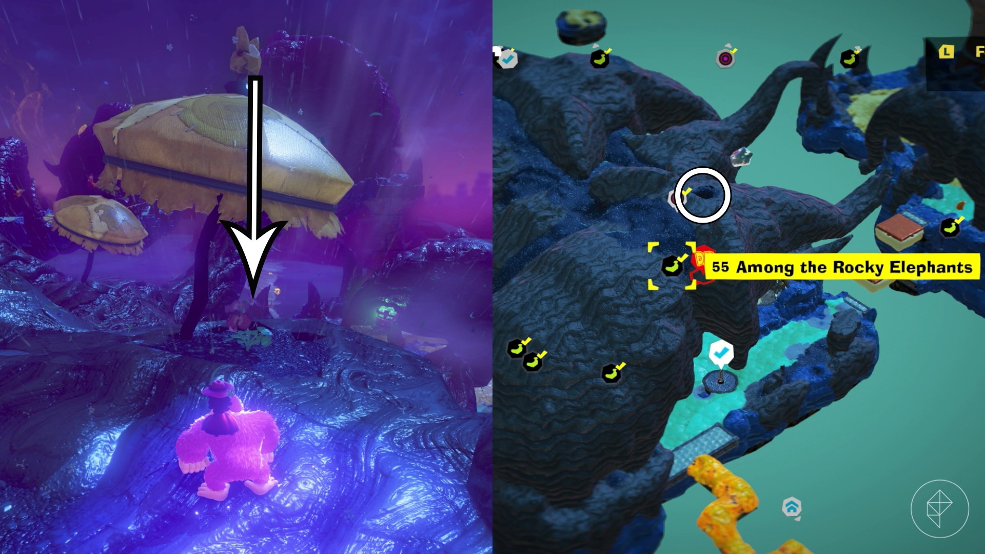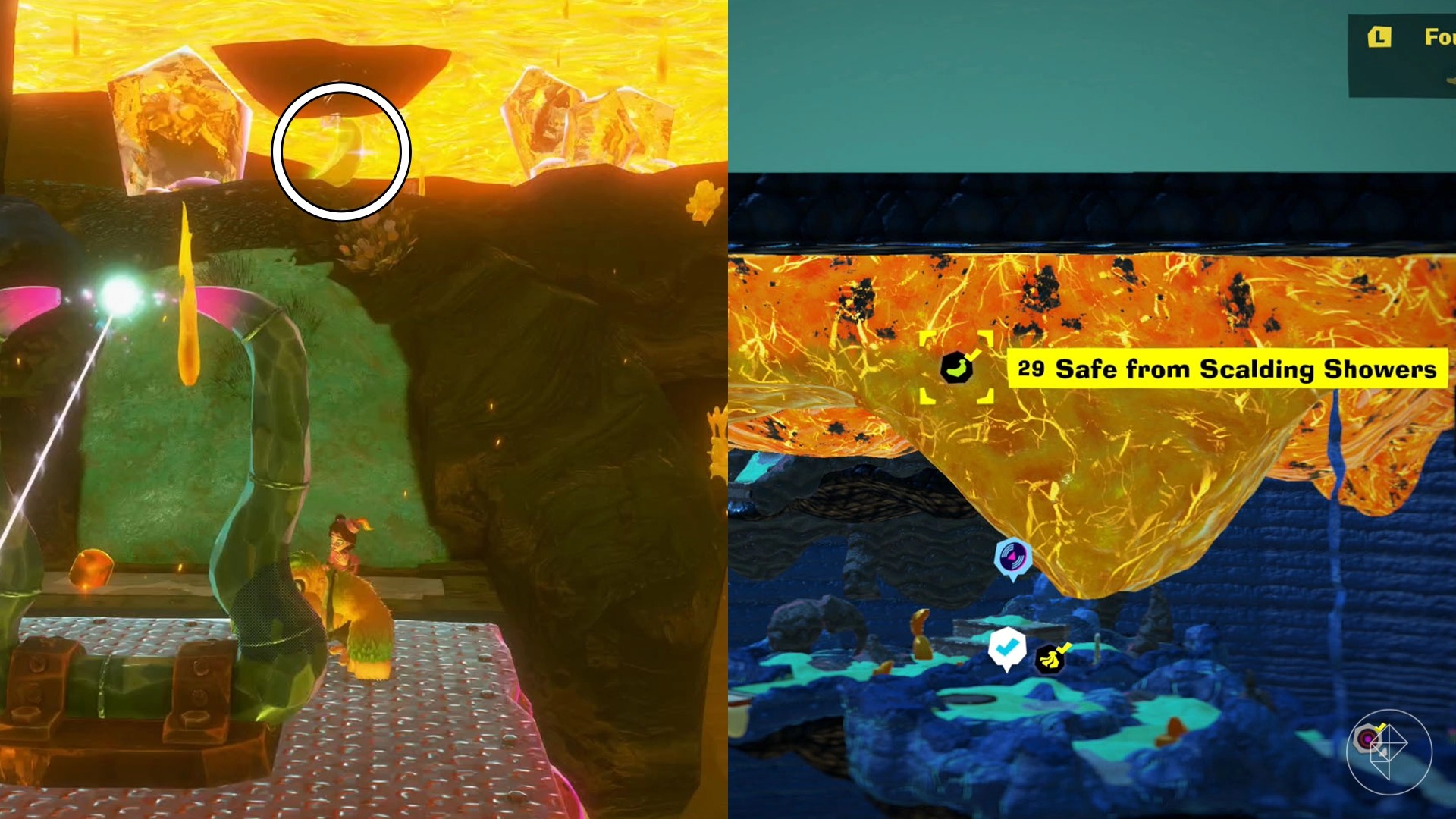 From the Trunk-Dunk Hot Springs waypoint, turn to the right a large metal elephant face on the wall. If you look at its trunk, you’ll see that lava is blocking its spout. Transform into your elephant form and suck away the lava to allow water to drop down. Swim over to the banana underneath the elephant head and break the banana by punching upwards.