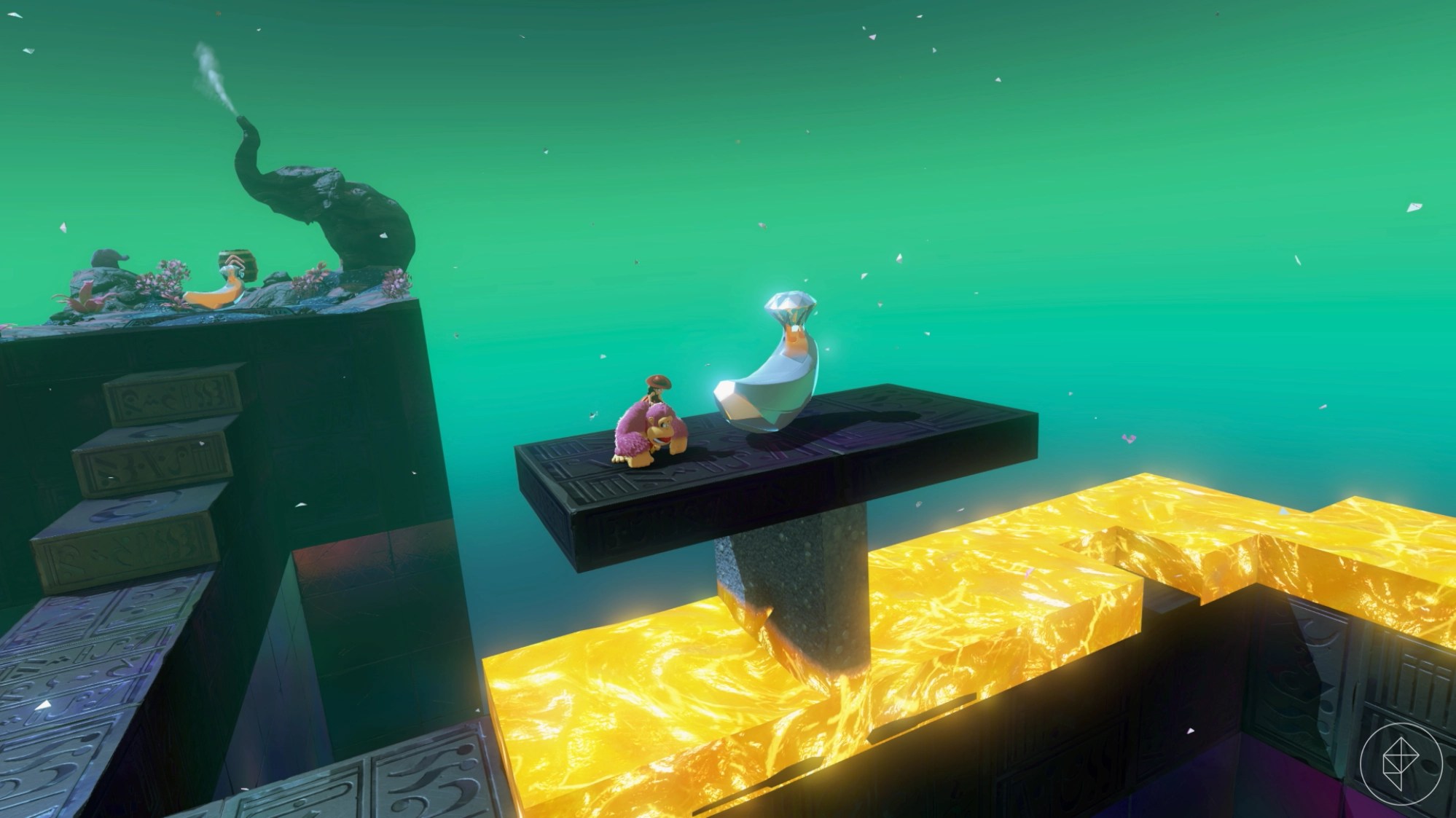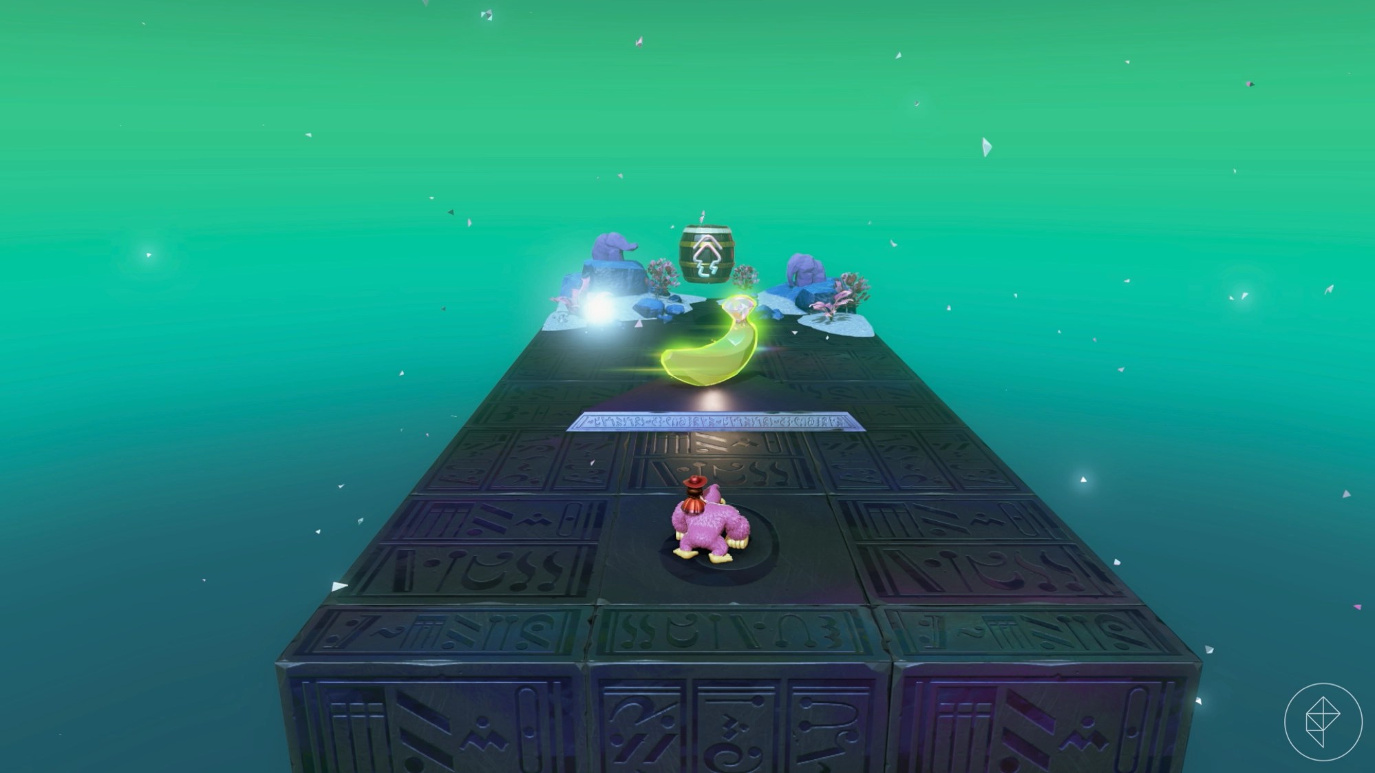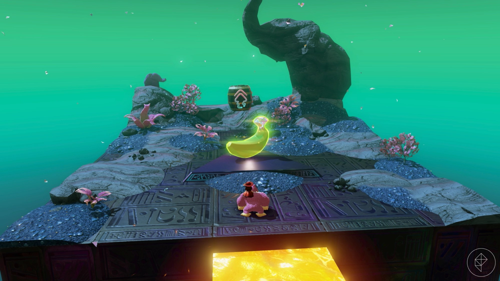Climb the stone elephant statue to the left of the layer’s entry point, and you’ll see gold lines indicating paths that floating cloud platforms follow. Throw terrain at the bottom of a platform to lower it, then use a hand slap to raise it back up again. (Midair hand slaps won’t work, so you have to actually slap the platform.) The tricky part is that if you lower the next platform above you before the one you’re currently on rises, the impact of your platform rising will make the next one go back up as well. One way to approach this is to tear off several rock chunks and take them with you as you make your way up by pressing R to drop them on the platform before you use a hand slap to raise it. The platform’s momentum will make the chunks fly into the air, so try keeping them flat on the surface and not too close to the edge. Repeat this method until you reach the final platform and the banana.