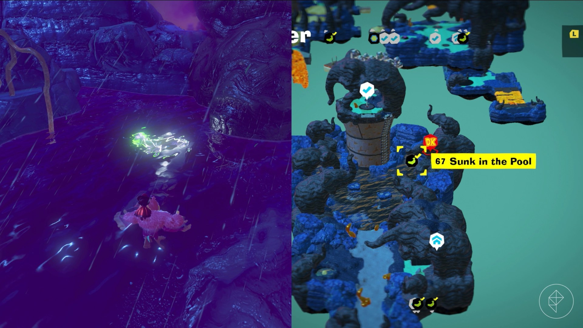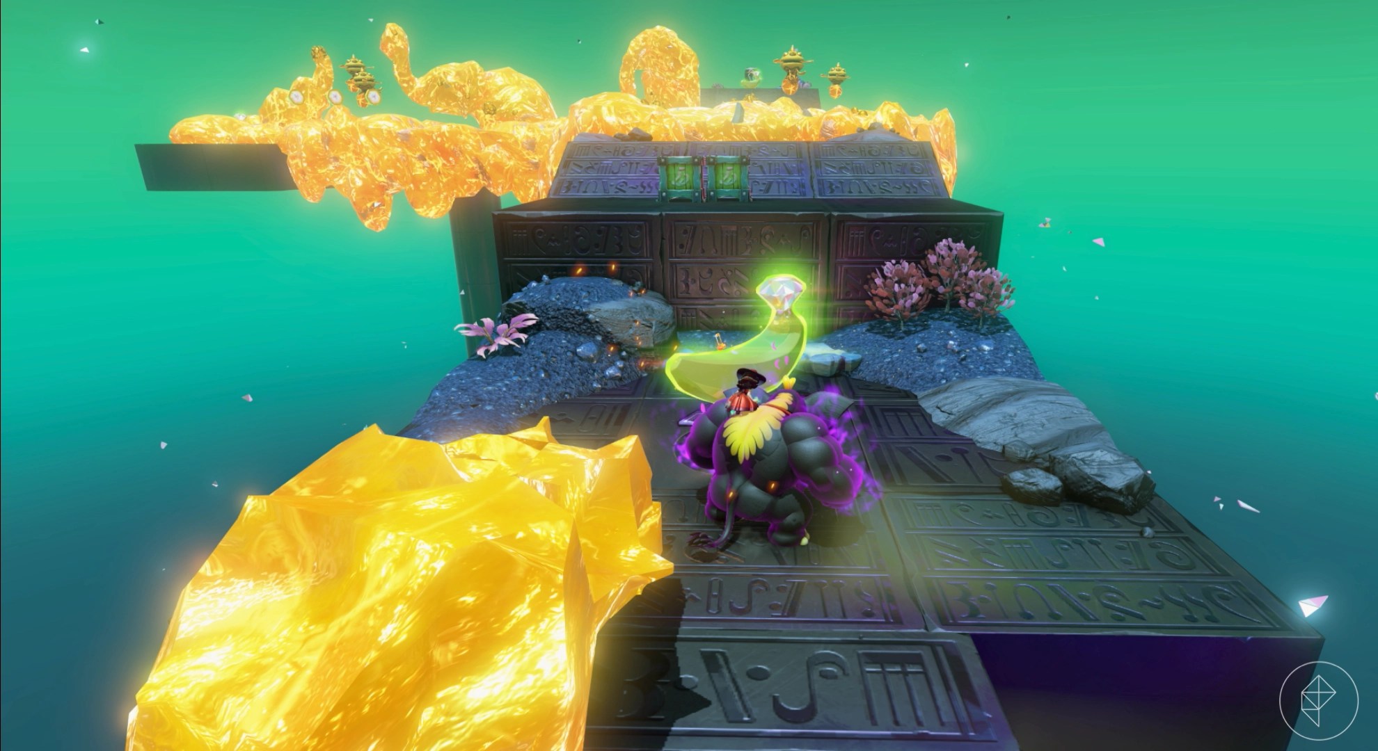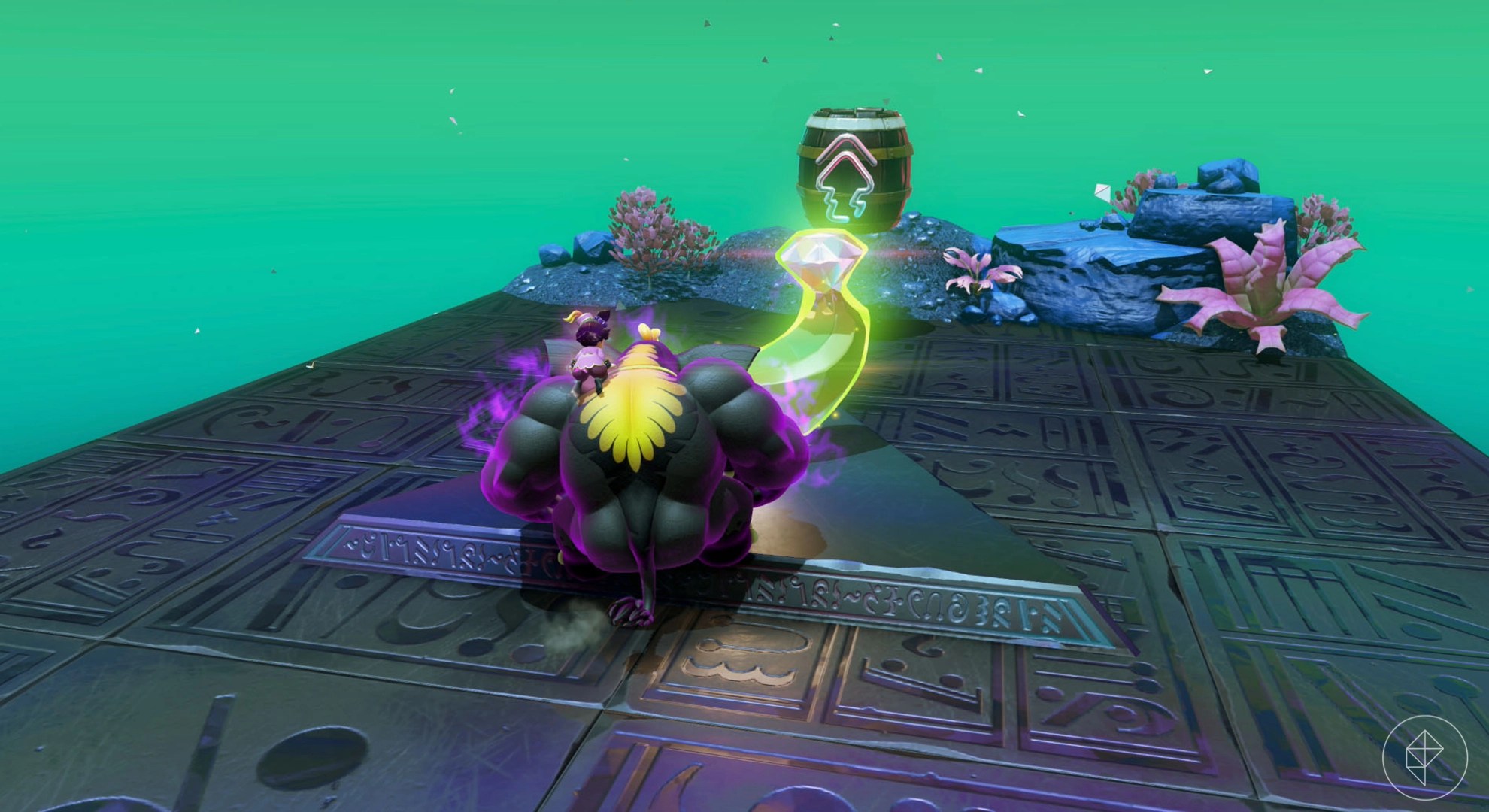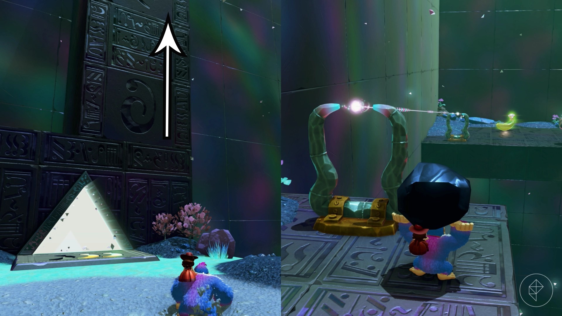 Climb the stone elephant statue to the left of the layer’s entry point, and you’ll see gold lines indicating paths that floating cloud platforms follow. Throw terrain at the bottom of a platform to lower it, then use a hand slap to raise it back up again. (Midair hand slaps won’t work, so you have to actually slap the platform.) The tricky part is that if you lower the next platform above you before the one you’re currently on rises, the impact of your platform rising will make the next one go back up as well. One way to approach this is to tear off several rock chunks and take them with you as you make your way up by pressing R to drop them on the platform before you use a hand slap to raise it. The platform’s momentum will make the chunks fly into the air, so try keeping them flat on the surface and not too close to the edge. Repeat this method until you reach the final platform and the banana.