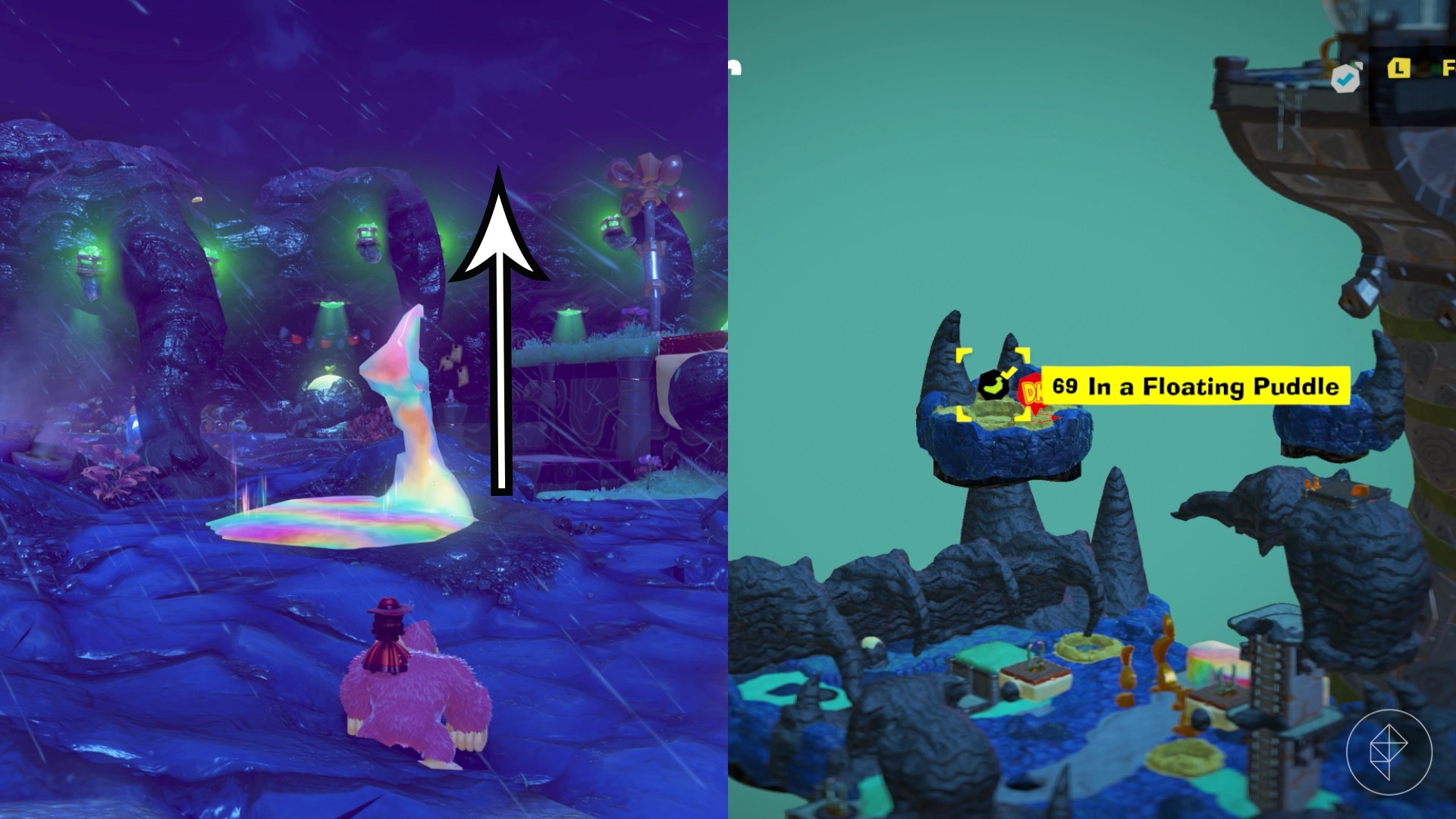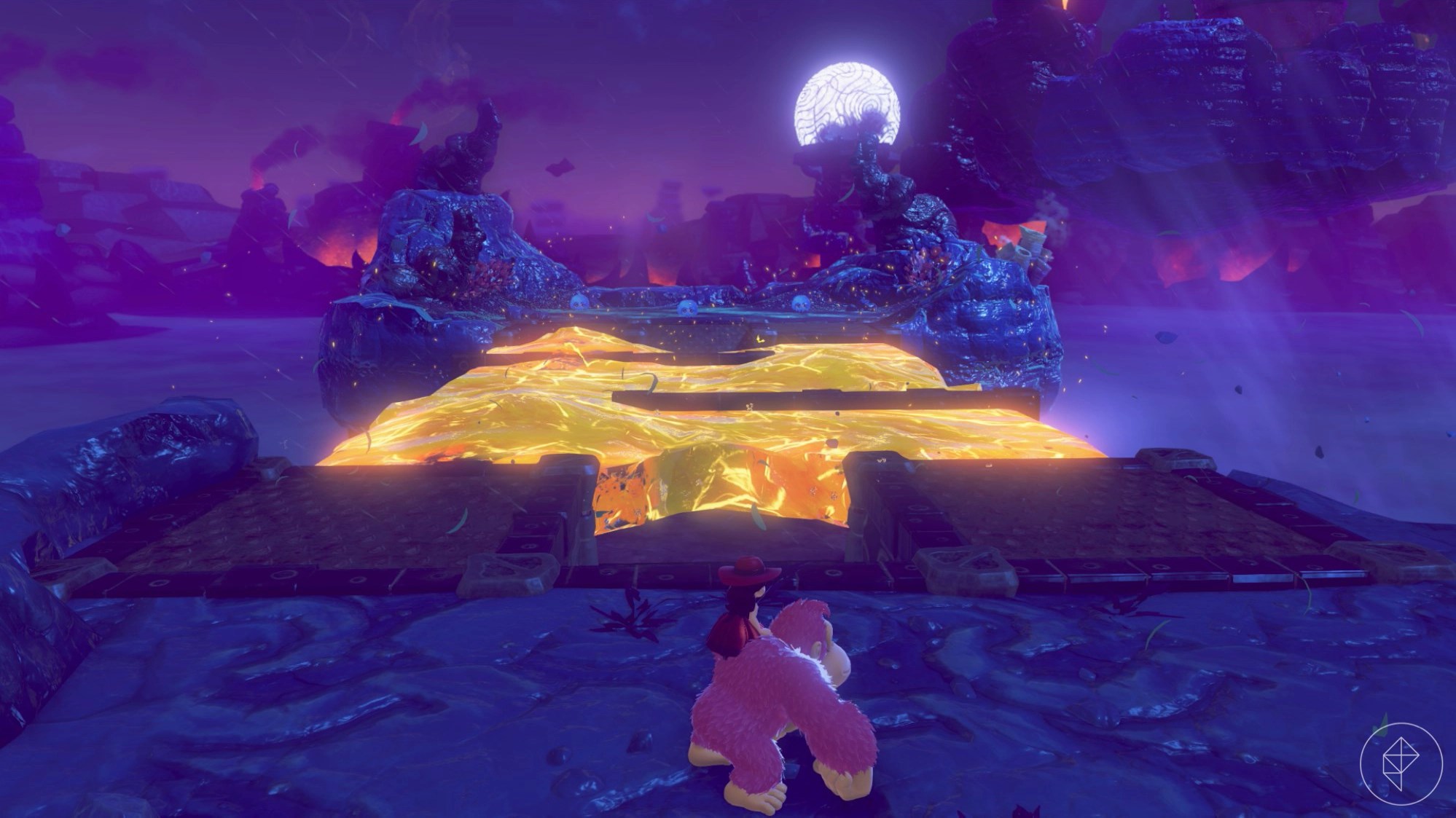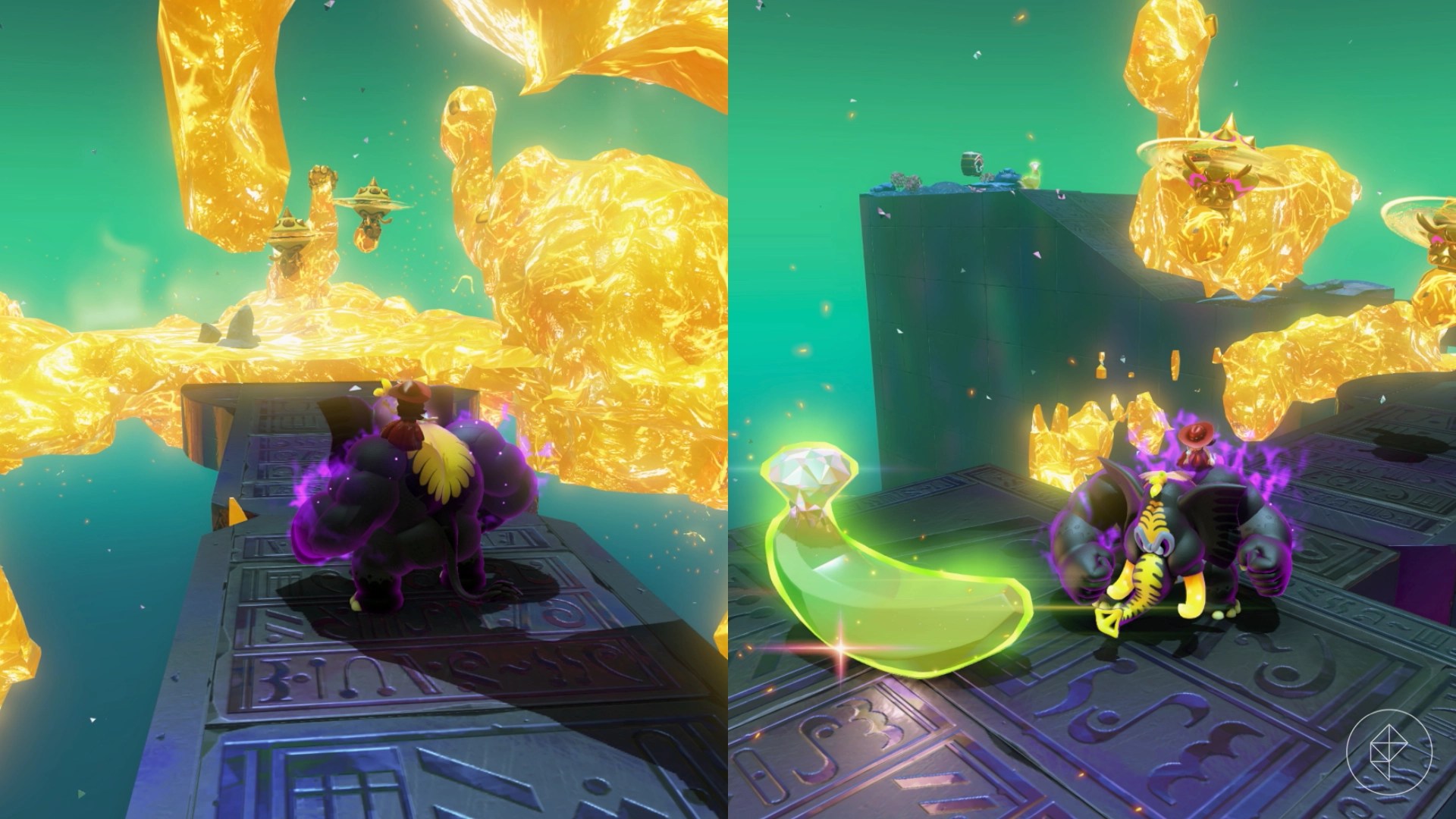 This Fragmentone banana requires a bit more patience than the others, though the fragments themselves aren’t in a hard-to-find place. Suck up the lava using Elephant Bananza and carefully escort the fragments on the metal bridge, being mindful of the thunderbolts coming down. The lightning will leave circles on the metal surface that the fragments cannot touch without dying, so be very patient and wait for them to disappear before proceeding.