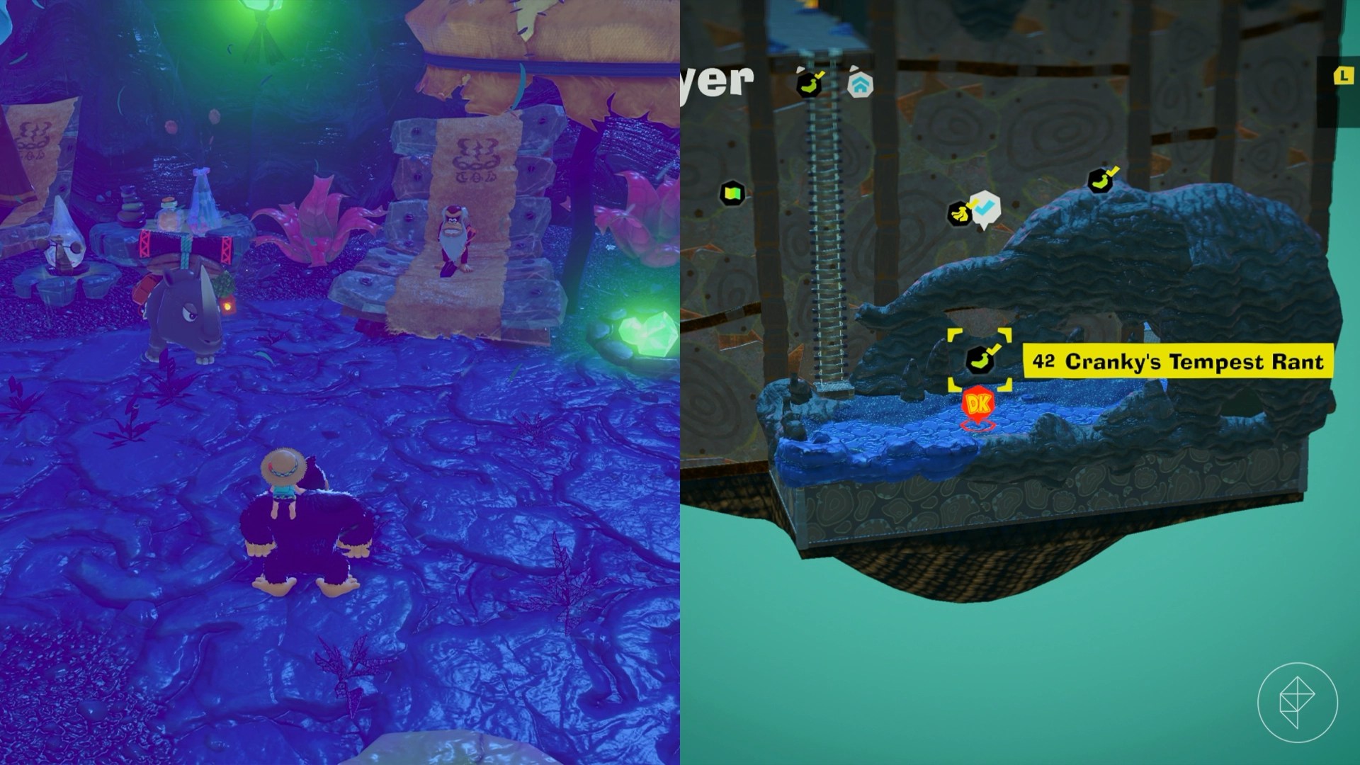 After you teeleport to the Trunk-Dunk Hot Springs, turn to the left to spot an entryway that leads outside of the spa. Head outside to find Cranky Kong sitting on a resort chair. Interact with him and listen to his rant to get a banana.