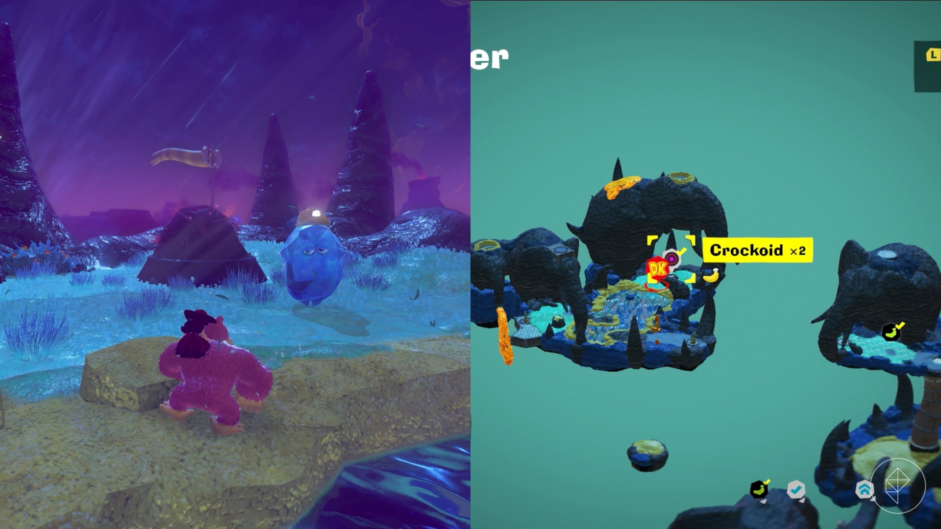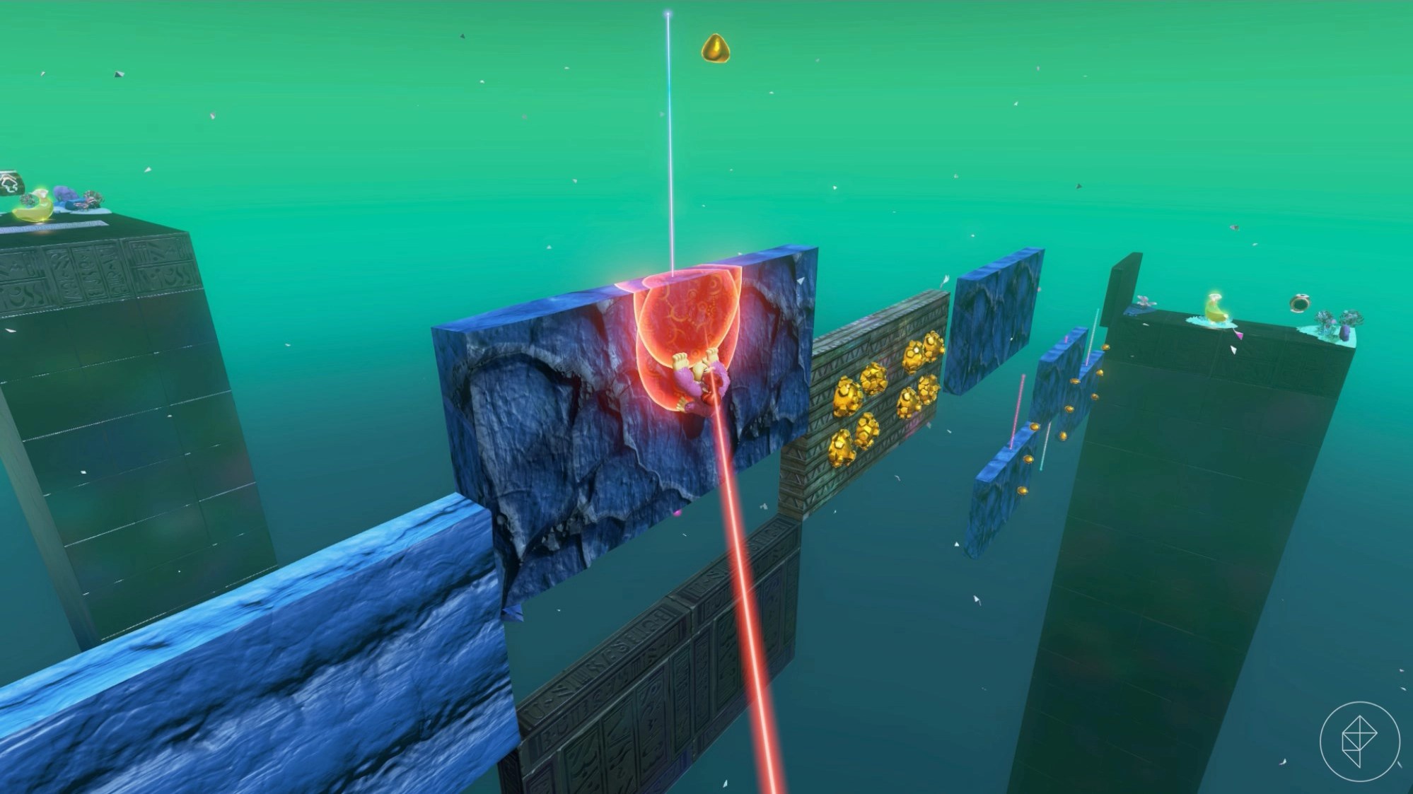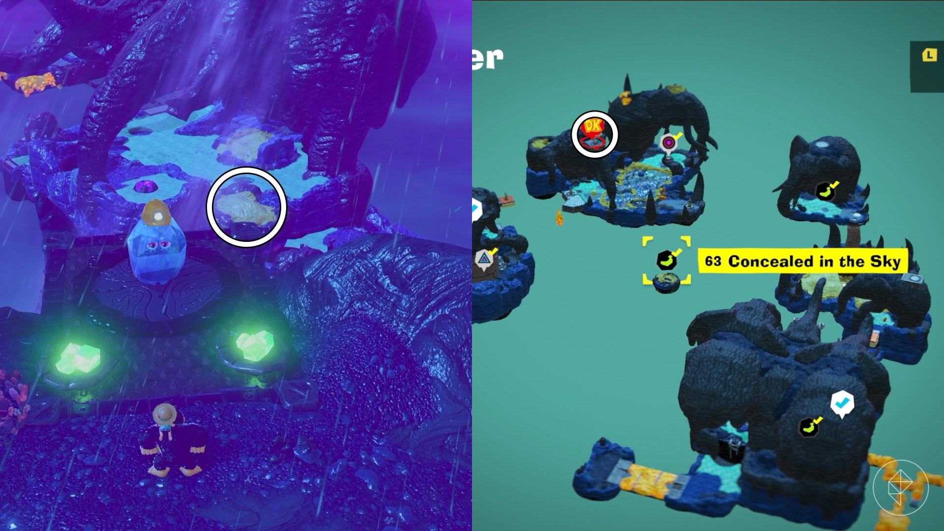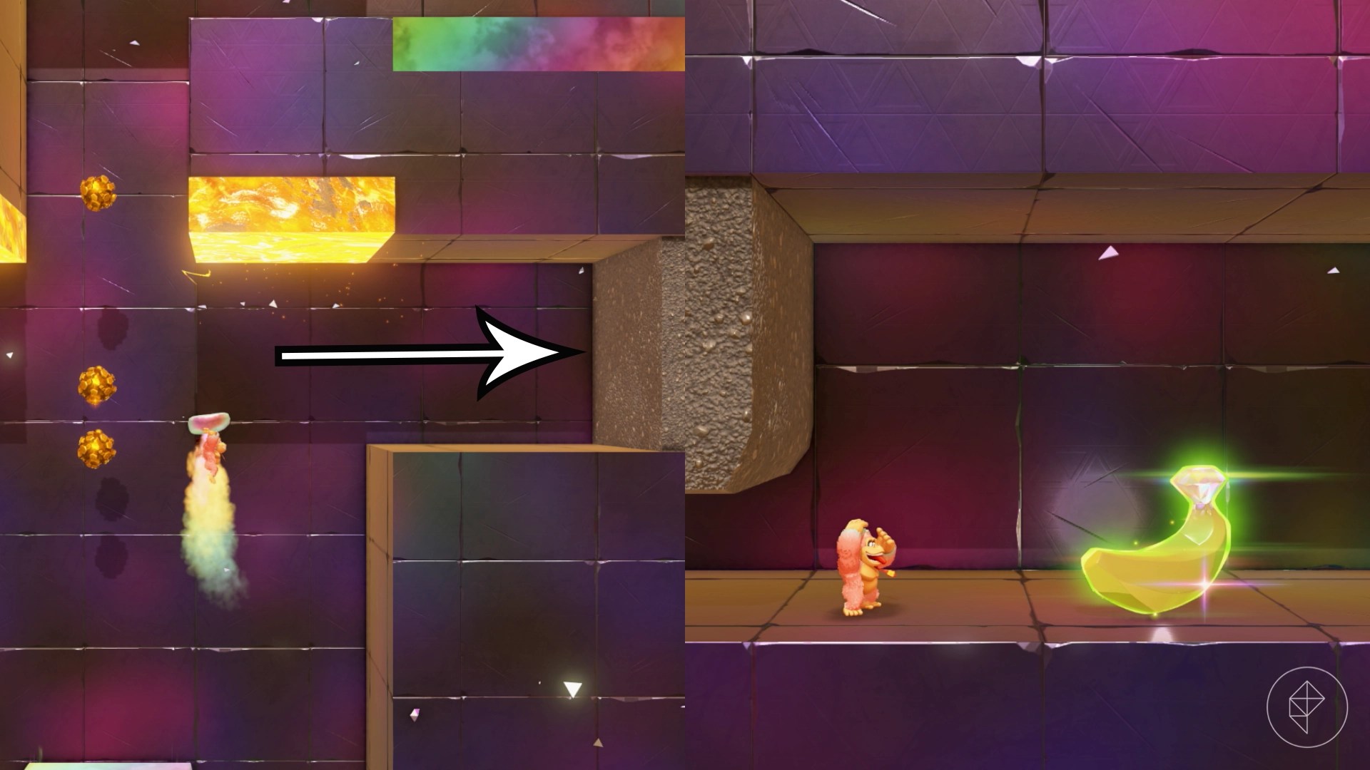 On the upper level of the initial area in Sublayer 902, you’ll find a set of three platforms. You can chunk jump onto the first platform, but the other two seem impossible to reach. Transform into your elephant form and suck up enough material until you have at least three chunks in store. You’ll need to chunk jump up to each platform using your stored chunks, which you can bring out by tapping the ZR button. At the top, you’ll find a banana.