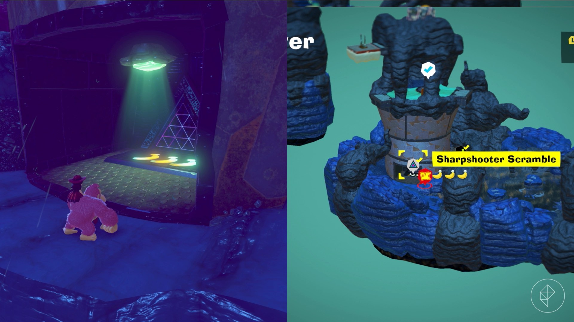 Break the shifty triangle to start the challenge and climb up on top of the liftoff ore. Pick up a chunk to fly up and break the metallic blocks at the top to earn your banana.