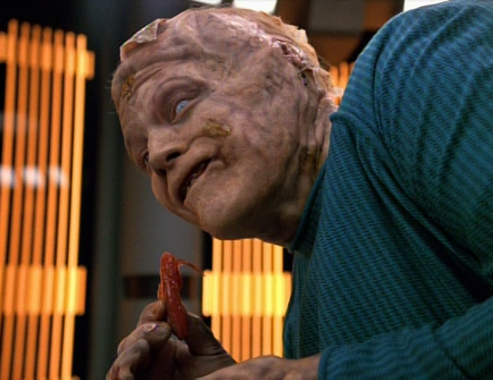 Which is where things start to get really, really weird. Apparently, breaking warp 10 has some knock-on effects on an organism, and Paris begins to undergo a grotesque transformation. His tongue and hair fall out, his skin grows sallow and spotted, he becomes allergic to water, he stops being able to breathe oxygen, and he begins behaving irrationally. Later, the ship’s doctor outright calls this a natural, albeit accelerated, arc of human evolution, saying, “It’s possible that Mr. Paris represents a future stage in human development, although I can’t say it’s very attractive.”