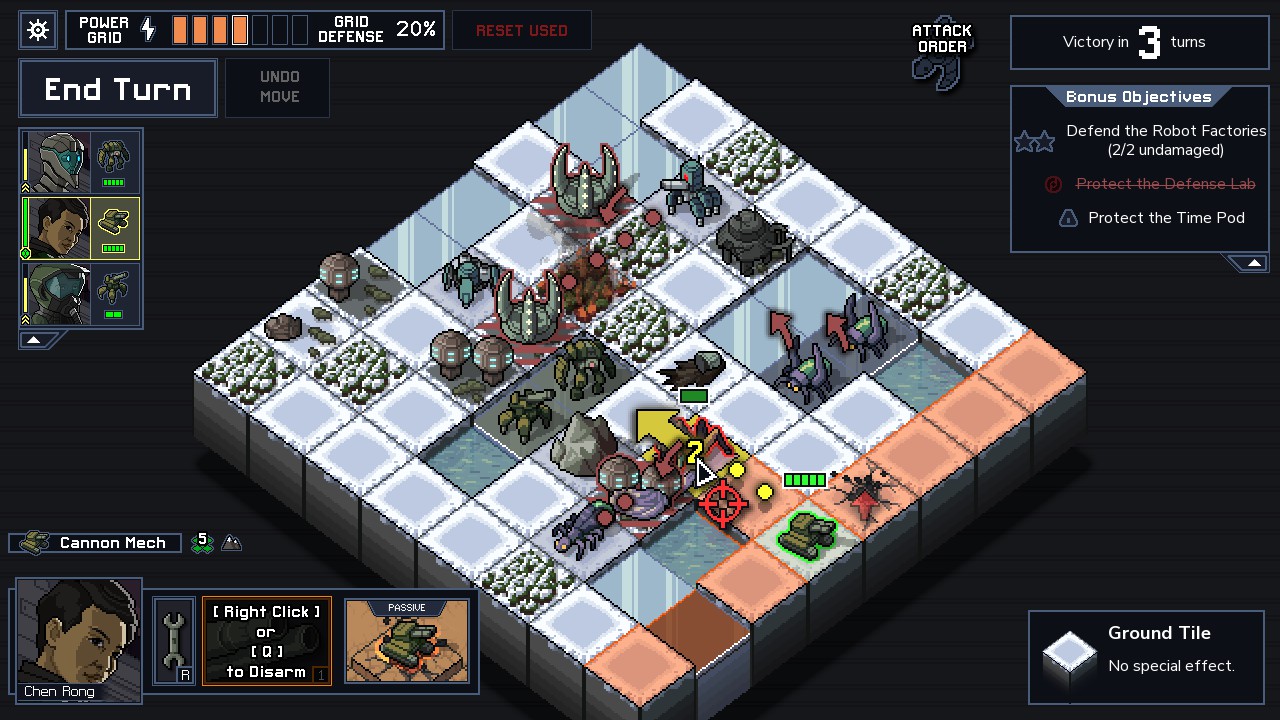 Civilian buildings provide power, which serves as a health bar for your campaign. Every time a civilian building takes a hit, you're a step closer to losing the war. Once your power is depleted your team travels back through time to try and save the world again. It's challenging, bite-sized, and dynamic. As you unlock new types of mechs and mech upgrades you gain inventive new ways to toy with your enemies.