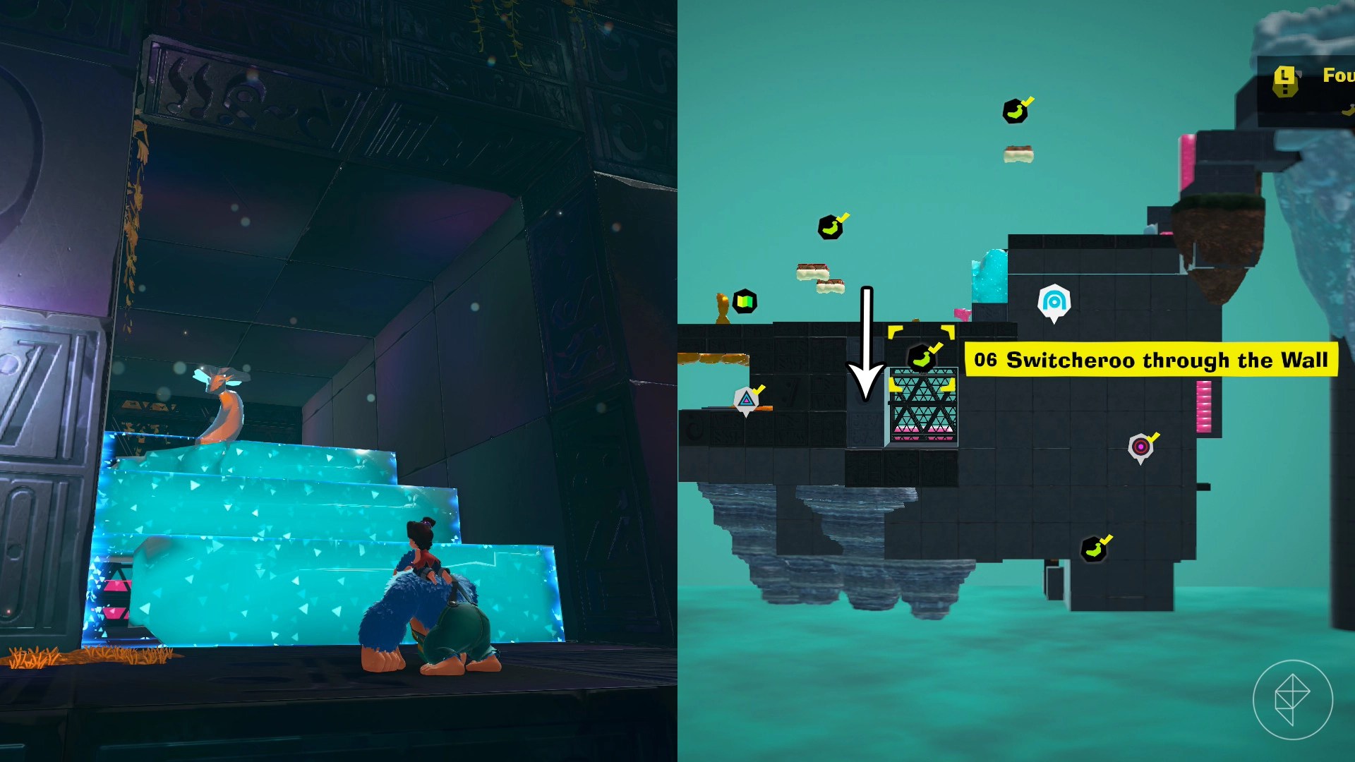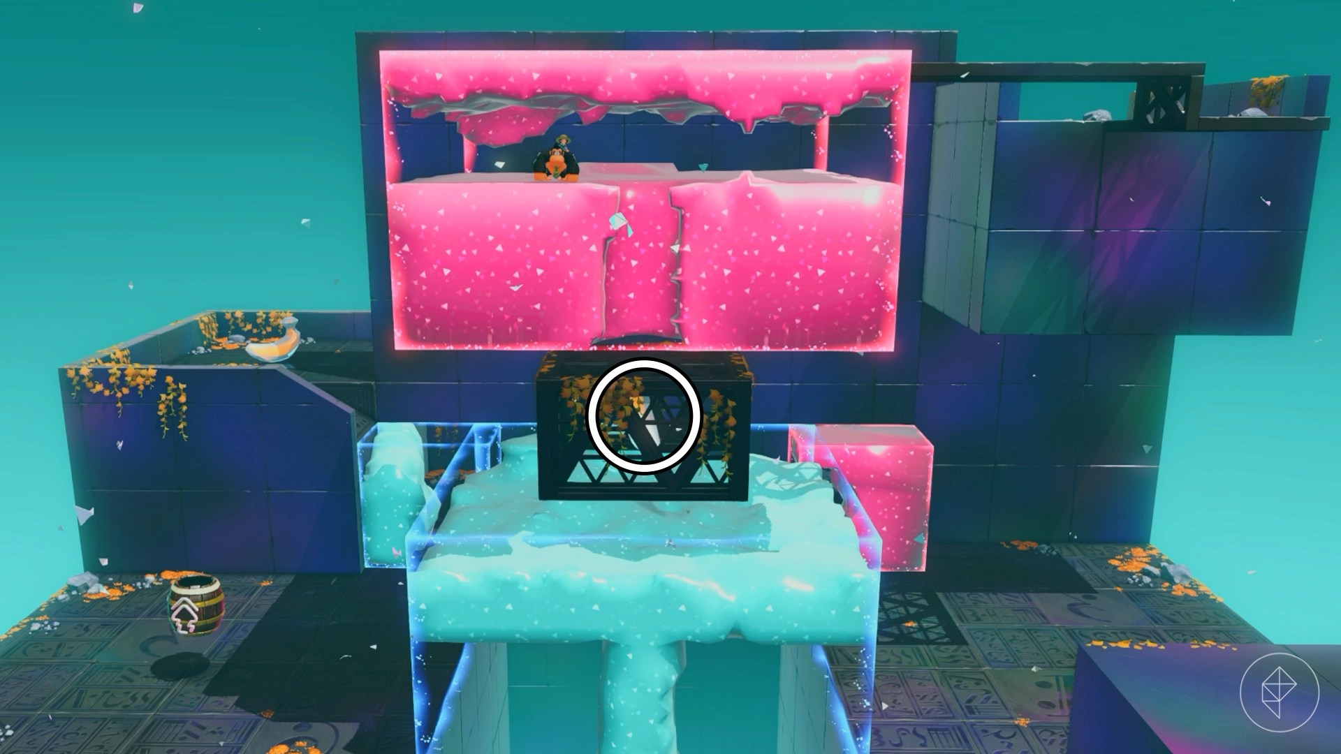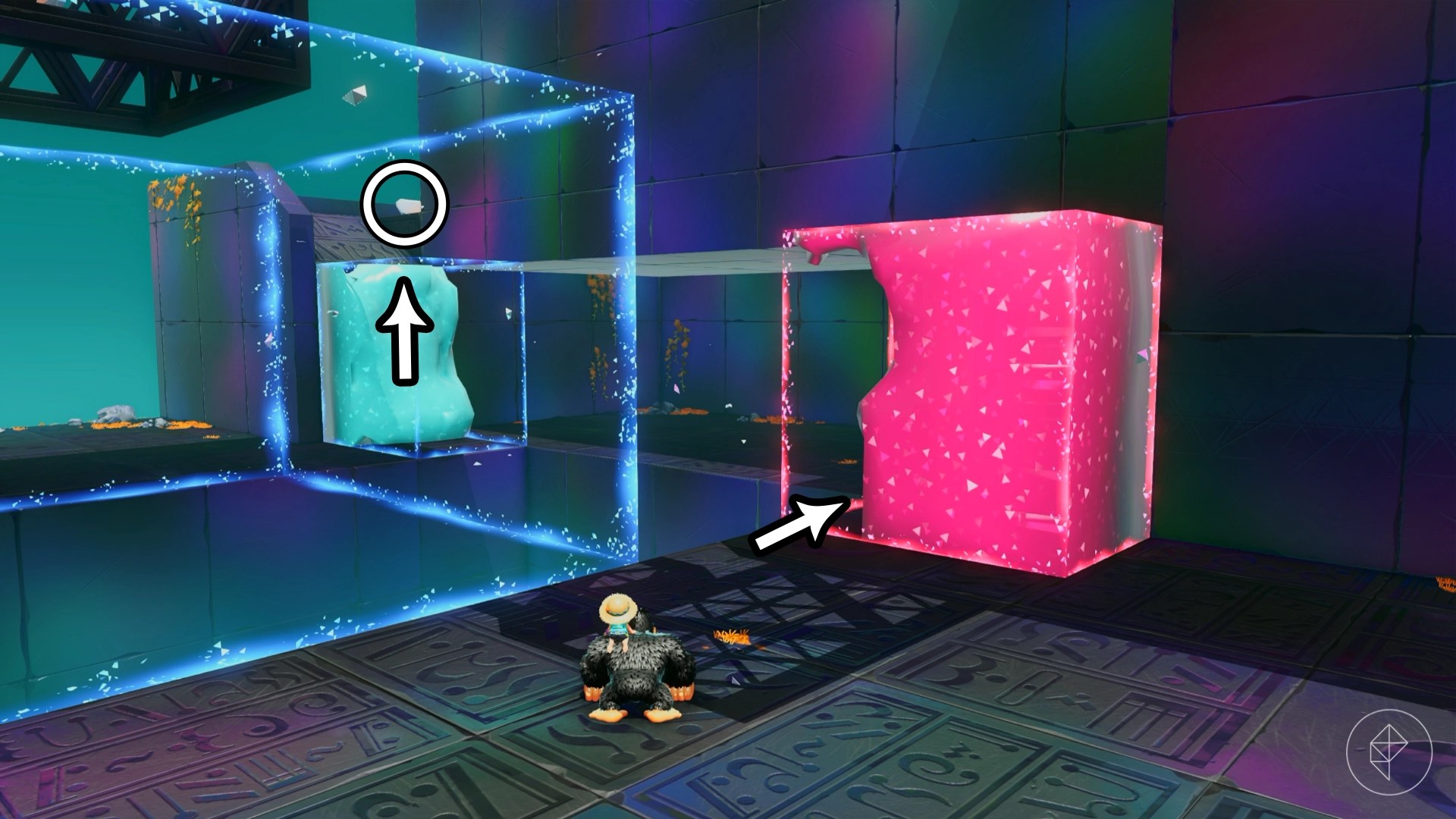 With your back to the Teeleporter, go to your right and jump down onto the platform to find a room with pink goo. Smash it to form a blue stairwell on the other side of the wall. Climb back up and drop off the opposite side this time to climb the stairs and reach the gem.