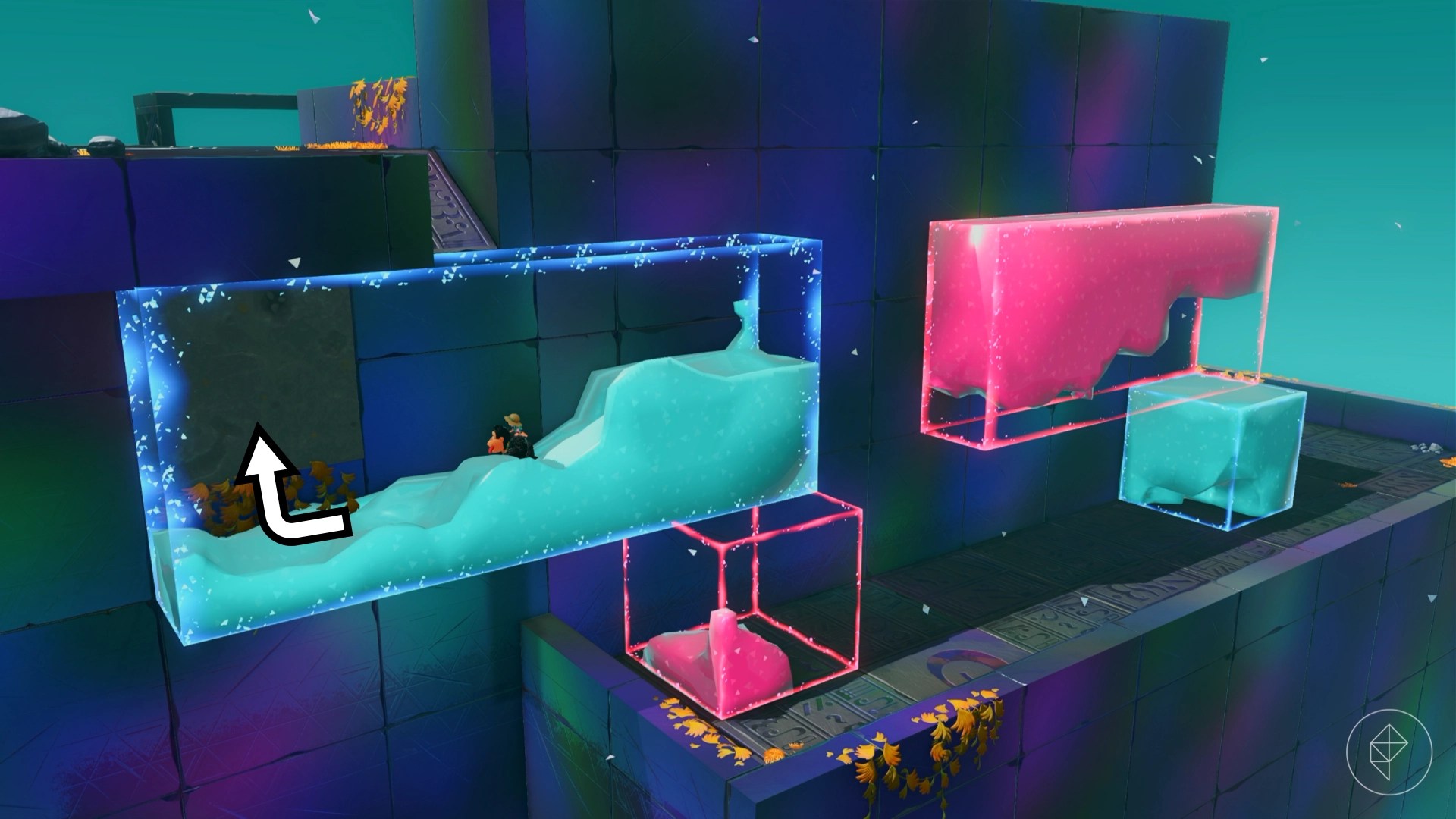 As you break the pink goo, it’ll create blue goo and vice versa. For the first gem, break through enough of the pink goo straight ahead to create a climbable blue goo path on the other side. There’s a gem waiting on the platform it leads to.
