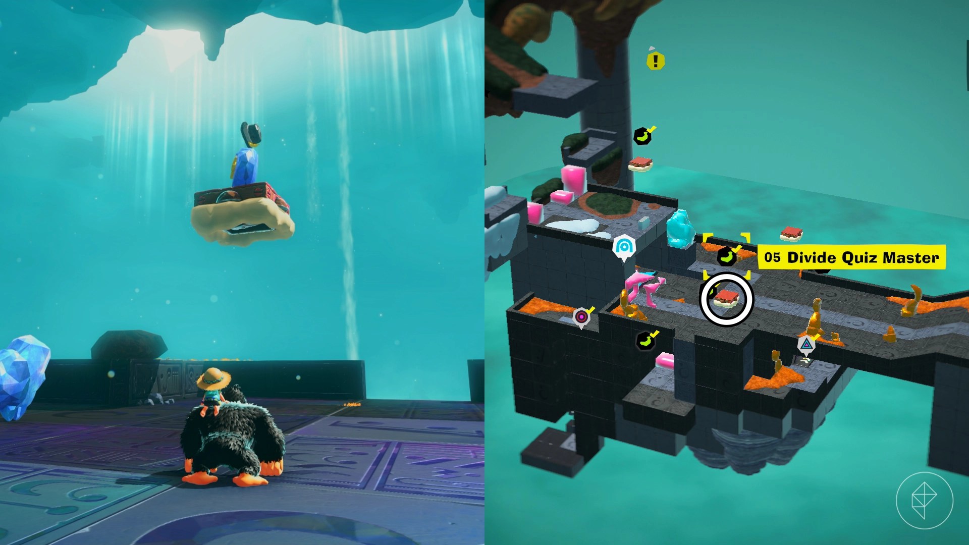 With your back to the Teeleporter, look up and to the right. You’ll see a Quiz Master on a floating platform. Throw a chunk at it to bring him to the ground and take his quiz to get a gem.