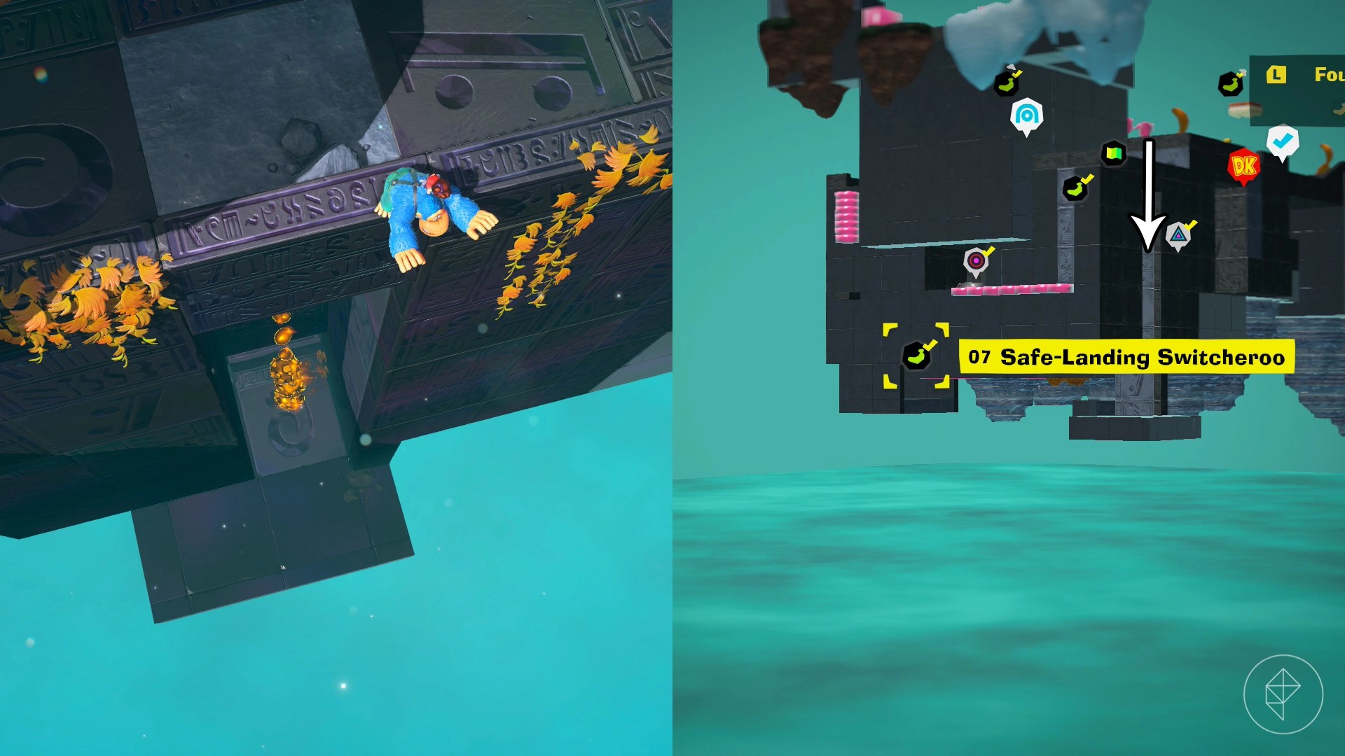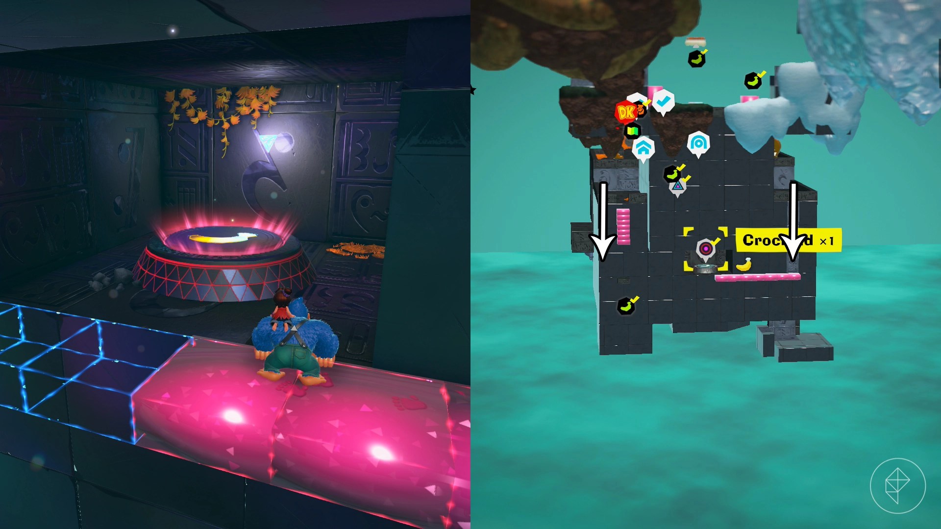 If you walk past the Teeleporter on either side, you’ll notice that you can drop down to a secret area. Follow the goo paths on either side and you’ll uncover an Ancient Ruin. Complete the battle course by pulling the turnips until you reach a Crockoid to defeat for a banana.