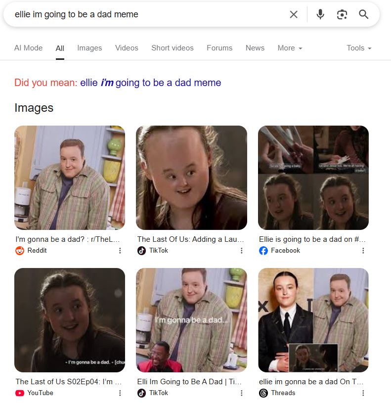 Unfortunately, the line did not land with fans, who ultimately turned into a meme. To wit, when I typed “ellie im going to be a dad” into Google, it auto-completed to add “meme” at the end. The top results are all Photoshops of the line read where Bella’s face has been distorted to capture the absurdity of the scene.