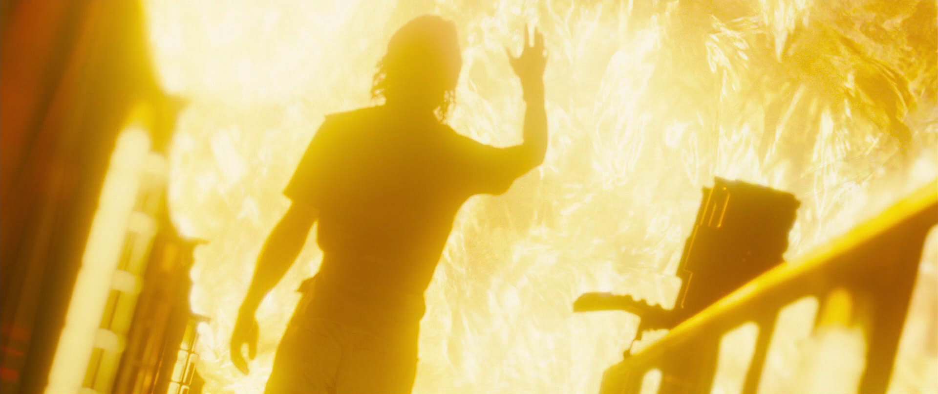 28 Days Later filters “reality” through miniDV pixels in a way that first makes an abandoned London look more real and later, more intense actions look increasingly abstract and nightmarish. Sunshine does something similar as it gets closer to the sun; a late-movie sequence set within the massive nuclear payload shifts the environment from the intricacy of a spaceship to the more abstract space of what looks like a gigantic cube of glowing lights. Once the movie crosses this threshold, it uses stuttering freeze frames as means of inserting disorienting micro-pauses into the most frenzied points of action, a technique further adopted by 28 Years Later.