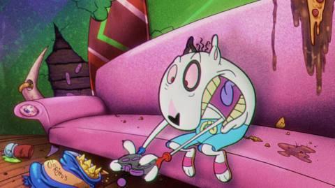 Alcazar’s 10-minute Bullet Time pilot stars Looney Tunes veteran voice actor Eric Bauza as Bullet, a bull terrier who aspires to gaming greatness. He’s a classic burnout ’90s cartoon character, crushing cans of Fizzy Juice and clobbering his way through the claymation fighting game Battle Blast. Mixing hyperactive visuals and hyper-detailed close-up shots straight of Ren & Stimpy, Alcazar’s inspirations are all remixed in a delirious vortex of caffeinated slapstick. The look is awesome — and as he learned putting it together over four years, painfully difficult to achieve.