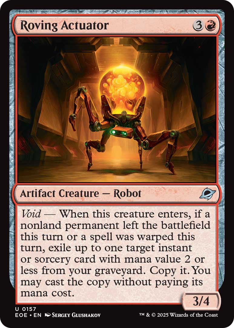The red artifact creature Roving Actuator uses “Void,” another new mechanic from Edge of Eternities, meaning you’ll want to play it on a turn when a nonland permanent has left the battlefield or a spell was warped in order to exile an instant or sorcery from your graveyard that costs 2 mana or less and then cast a copy of it for free. Red has plenty of cheap spells it can use to take advantage of this ability and Edge of Eternities has already revealed a lot of robots, so its type might wind up being important. It could also play well in decks that incorporate Blink effects, Treasure, or Clues to ensure you’re always triggering Void.