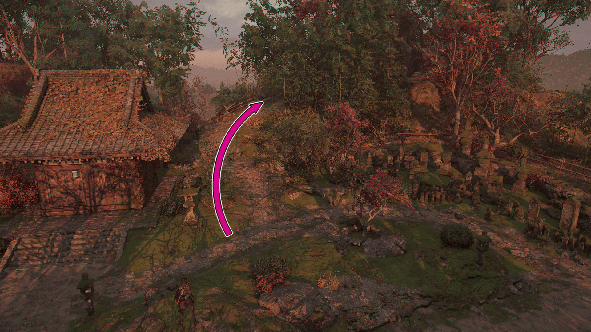 When you arrive at the location, the marker will disappear and you’ll have a fuzzy area to explore. Start on the Tennoji Temple area on the east side of the blur. There’s a narrow path leading out of a cemetery and up a small hill. Follow that path through the trees.
