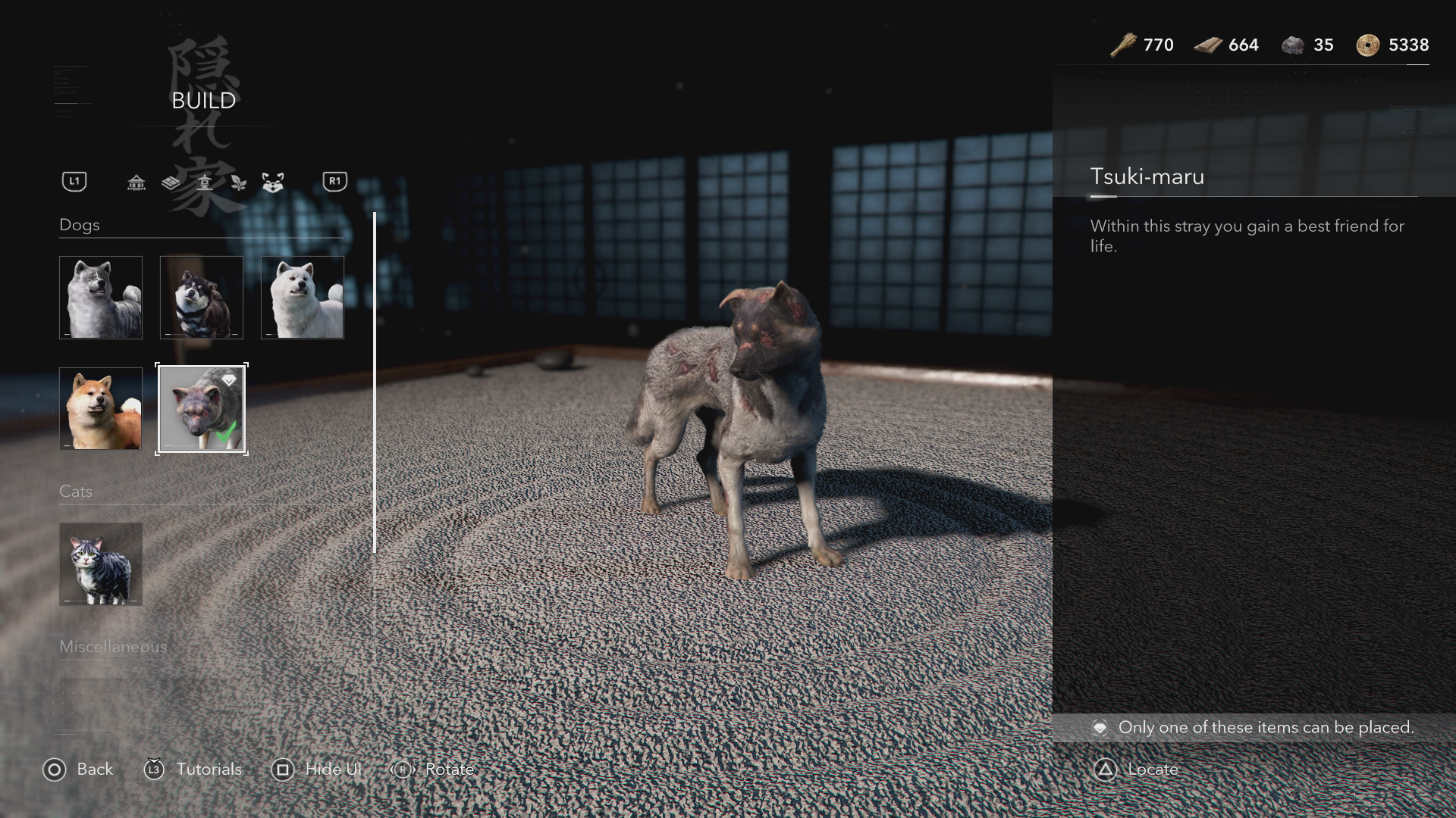 Open the Build menu and tab over to Dogs (and Cats) on the right. From there, you can place Tsuki-maru in your Hideout along with any other dogs and cats you’ve met.