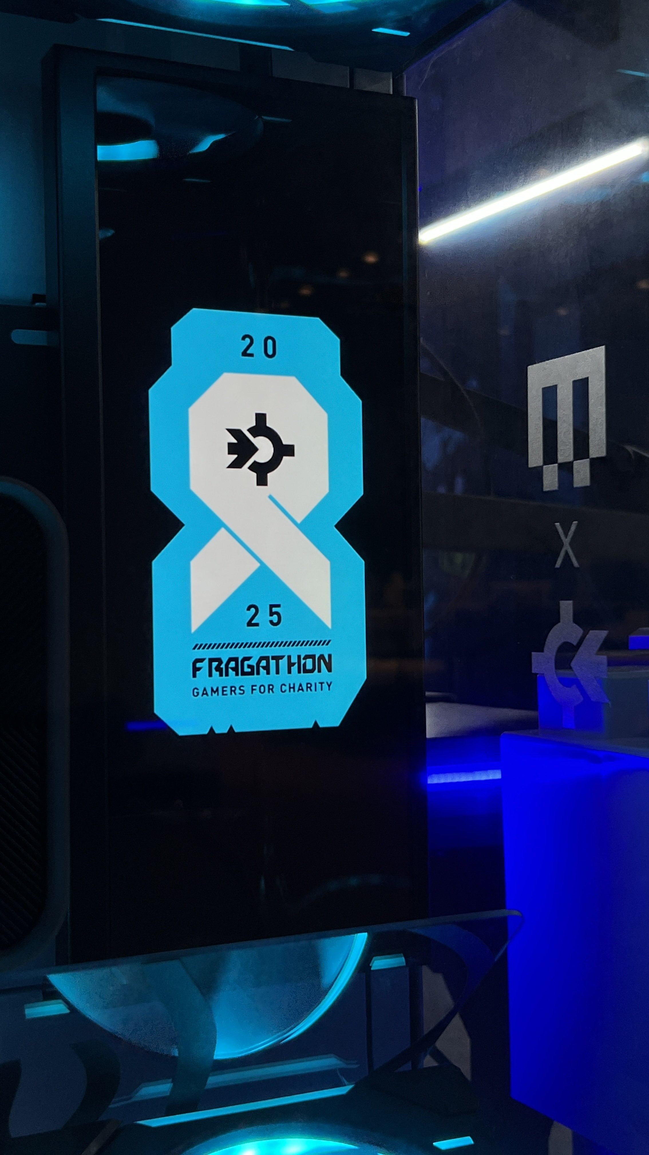 Six gaming PCs sit back to back in the blue LED-lit room, each with two monitors (one for gaming, one for reading chat) and a microphone. Where the walls aren’t covered up by Shroud-branded keyboards and signage, there’s graffiti depicting crosshairs and the Fragathon logo. The budget is a little higher than a LAN party you’d throw together with friends, but the DIY spirit is there. Grzesiek wanted it to “feel like the old gamer days when you would just play a bunch of different games with all your friends around you yelling, laughing, gaming, and creating memories together.”