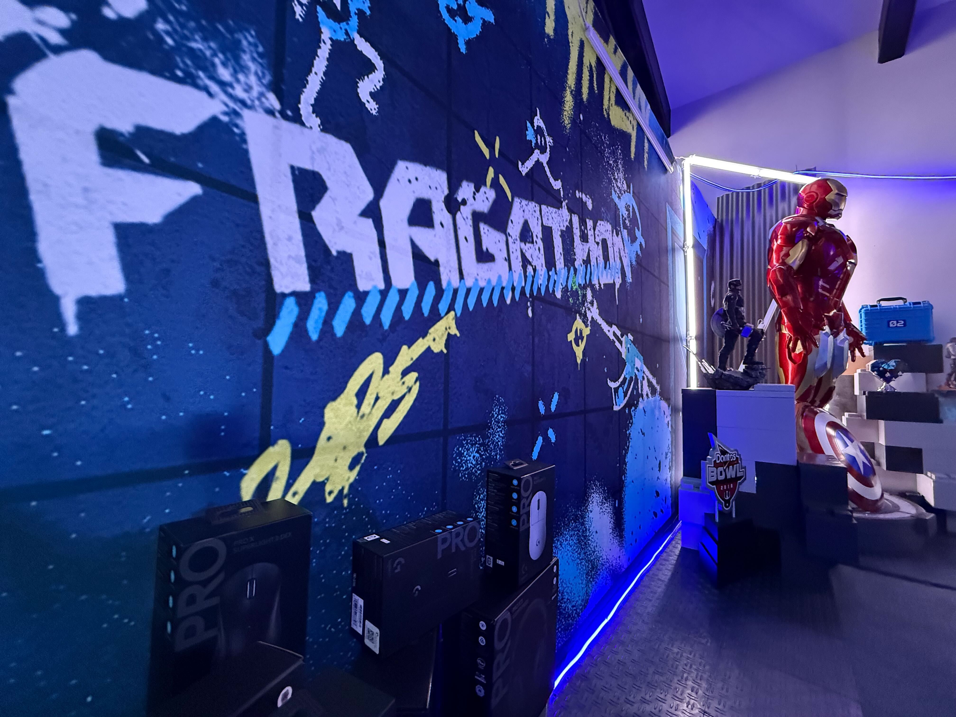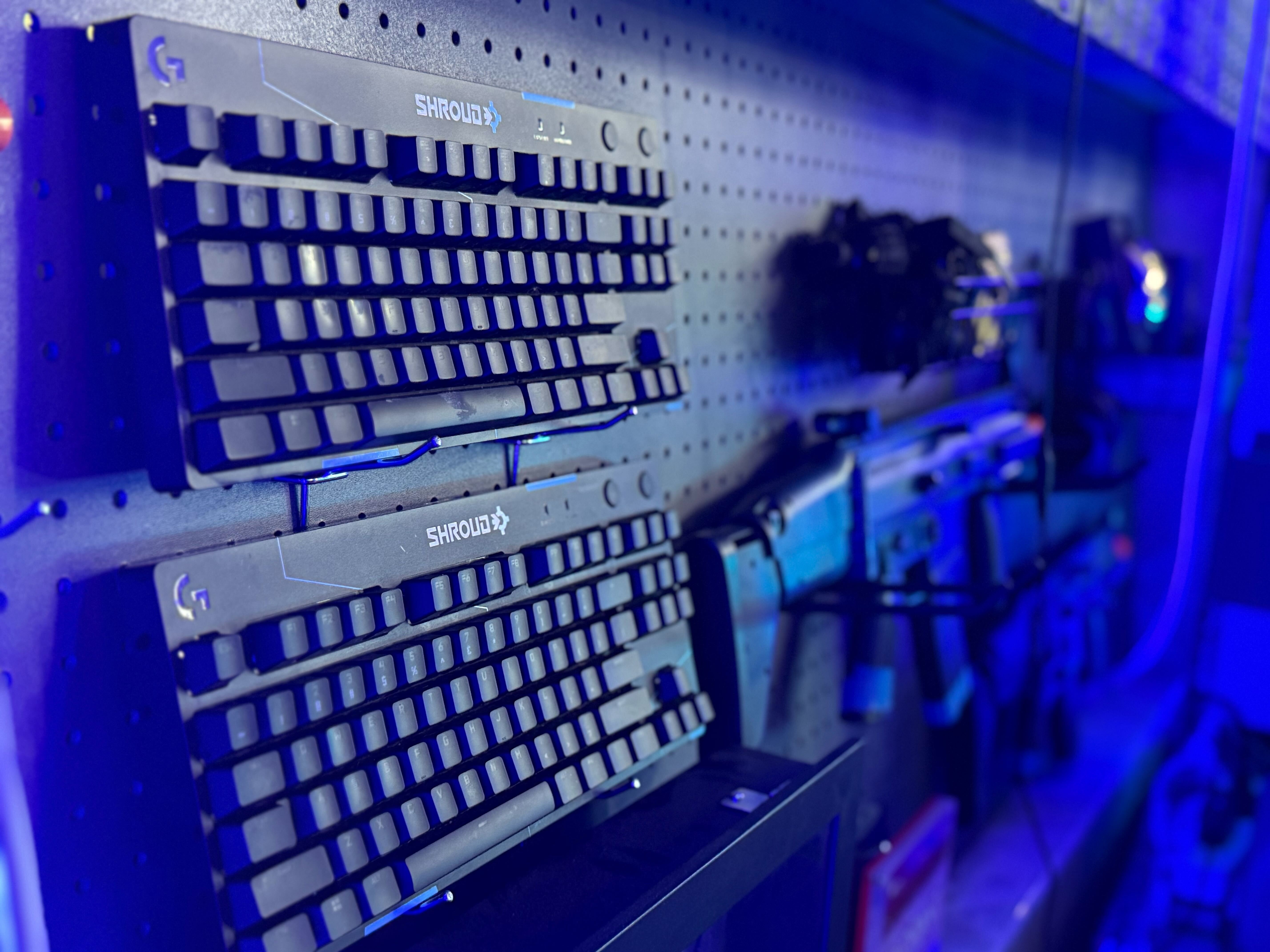 Six gaming PCs sit back to back in the blue LED-lit room, each with two monitors (one for gaming, one for reading chat) and a microphone. Where the walls aren’t covered up by Shroud-branded keyboards and signage, there’s graffiti depicting crosshairs and the Fragathon logo. The budget is a little higher than a LAN party you’d throw together with friends, but the DIY spirit is there. Grzesiek wanted it to “feel like the old gamer days when you would just play a bunch of different games with all your friends around you yelling, laughing, gaming, and creating memories together.”