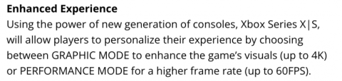 “Using the power of [the] new generation of consoles, [Xbox Series X/S and PS5] will allow players to personalize their experience by choosing between Graphic Mode to enhance the game’s visuals (up to 4K) or Performance Mode for a higher frame rate (up to 60 FPS),” the GameStop listing reads.