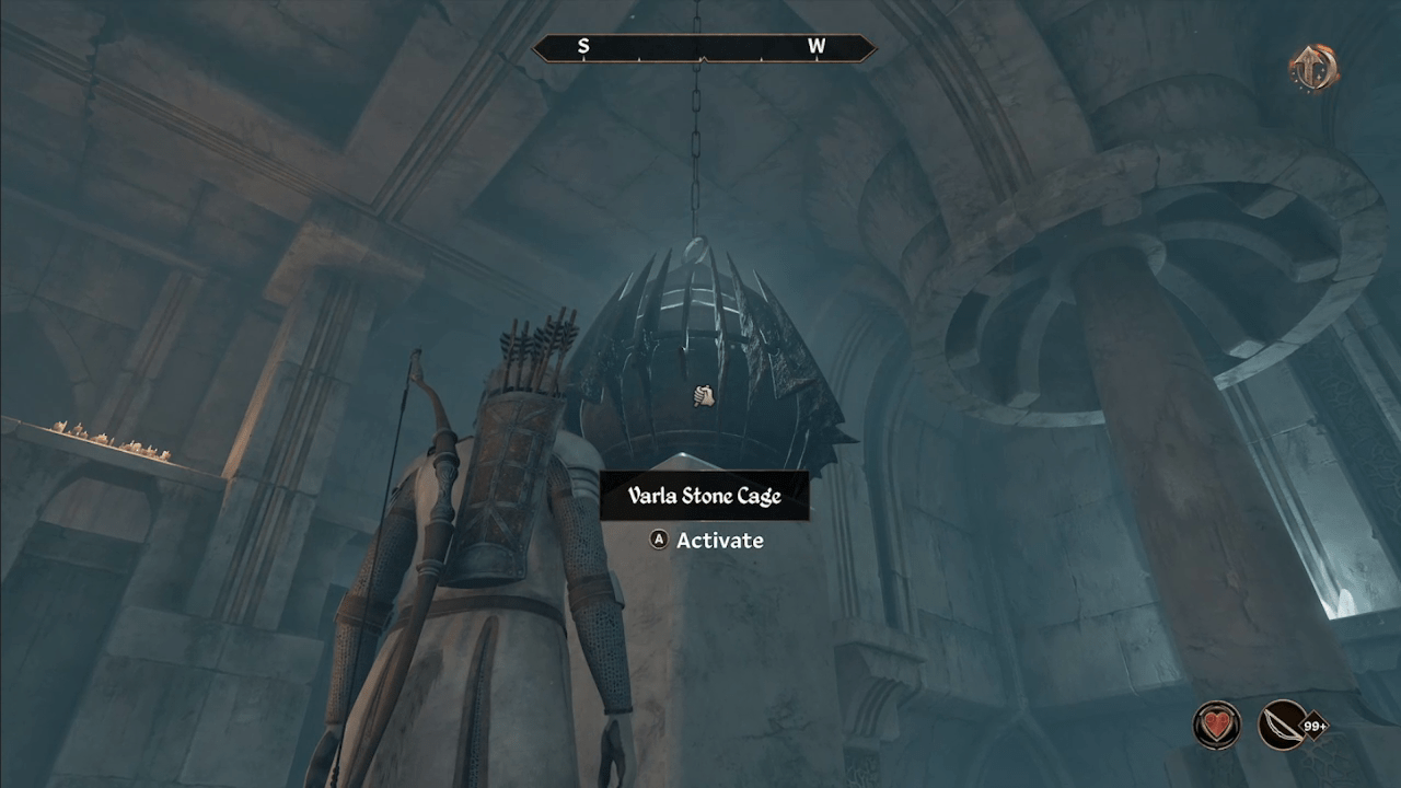 You can get a varla Stone, a valuable item worth 1,000 gold, if you know the right switch to press. When in the far south room of Vilverin Wendesel, you will see a “Varla Stone Cage” hanging in the center. Defeat the undead and walk up the stairs that lead to the upper level of the room. There is a cube-shaped switch there. Press it and the cage containing the stone will lower and you can go collect it.