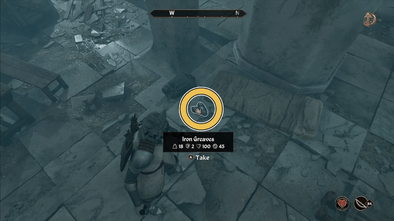 If you look to the right of the cart, you’ll see some sleeping bags on the ground. You can also pick up a set of iron greaves that are sitting on the ground.