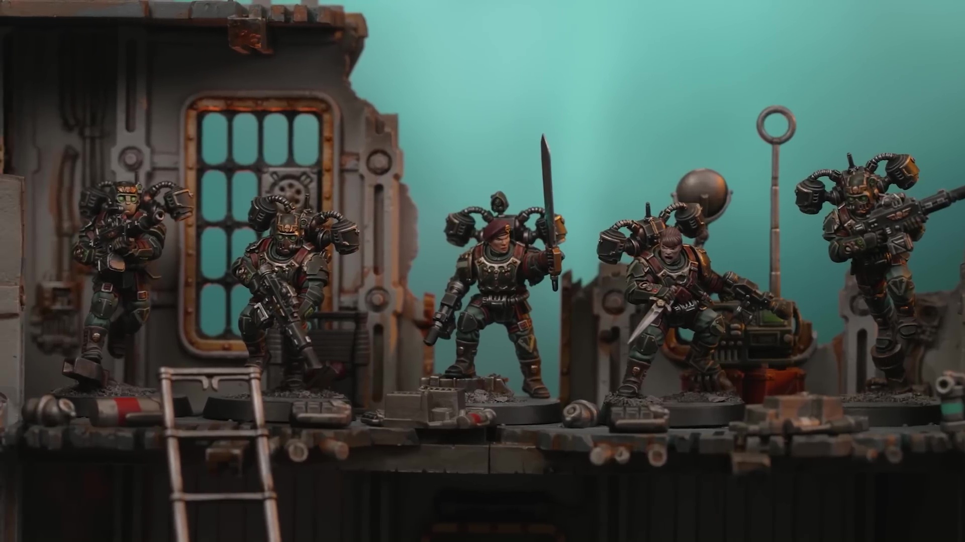 A group of miniatures of the Imperial Guard’s Tempestus Aquilons, set up in front of some terrain for the tabletop game Warhammer 40,000: Kill Team - Hivestorm