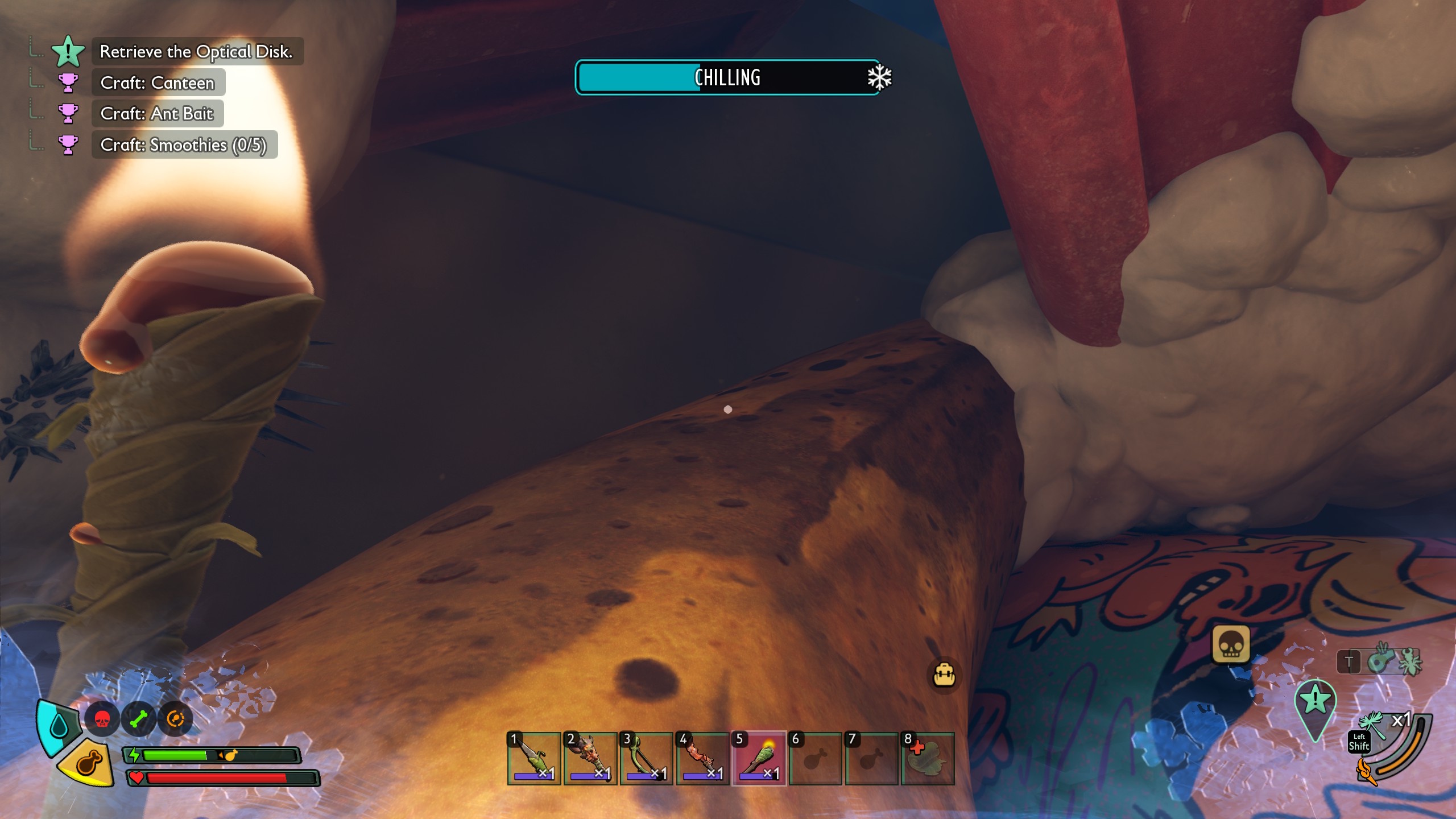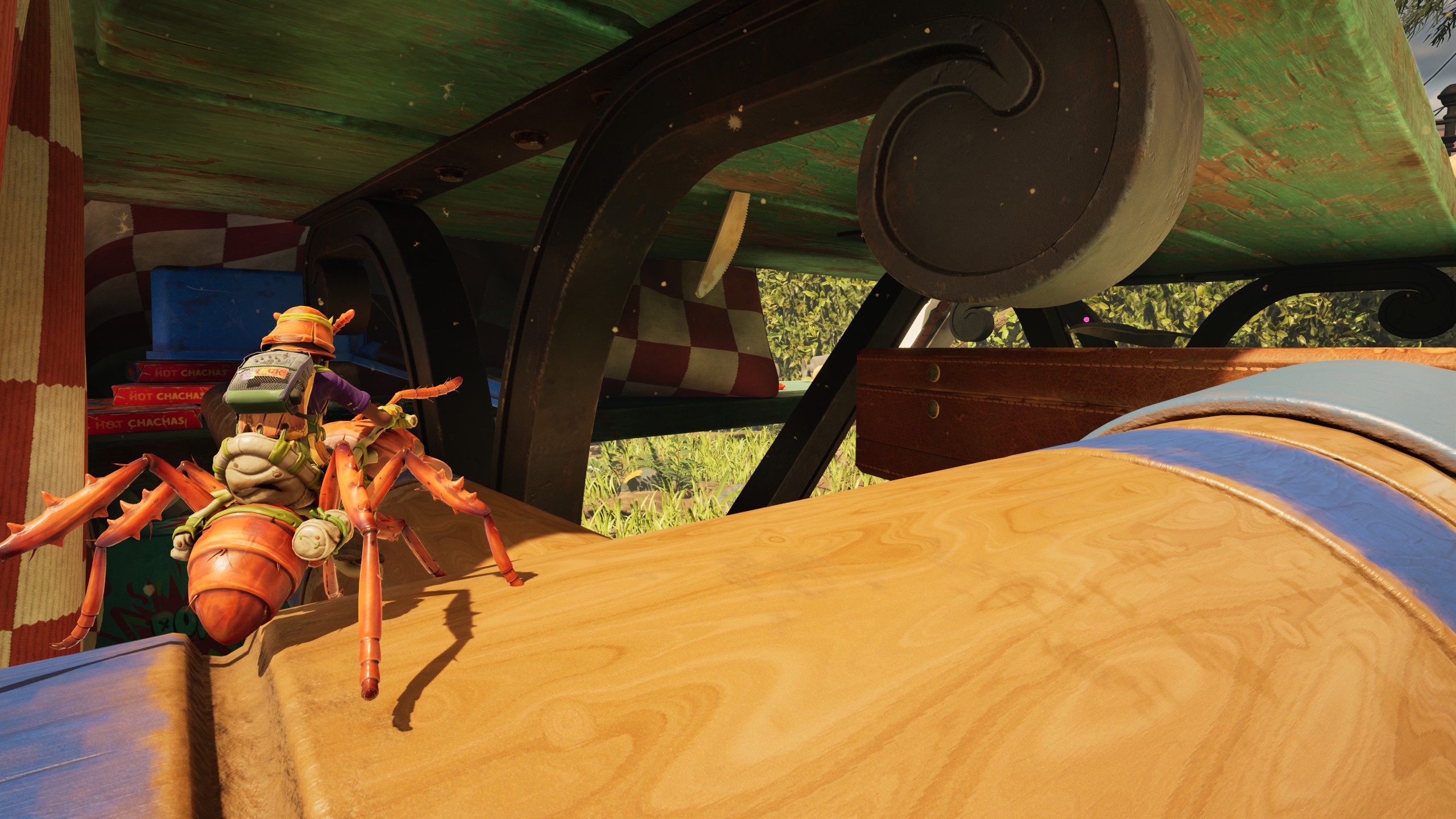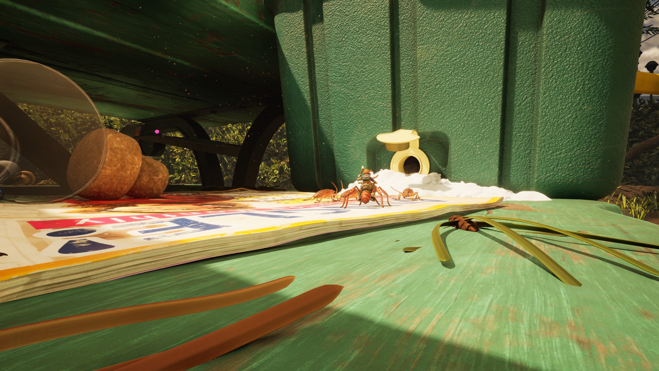 Climb up the picnic blanket on your buggy, and don’t stop to deal with the O.R.C Weevils along the way, as they explode and deal hefty damage. Once you reach the seat, turn right, and go under the cloth. Ignore the Orb Weaver Jr, and walk across the bar to reach the other side. You’ll see a briefcase and some small roaches. Go ahead and defeat the roaches, since you need roach chunks for the axe upgrade.