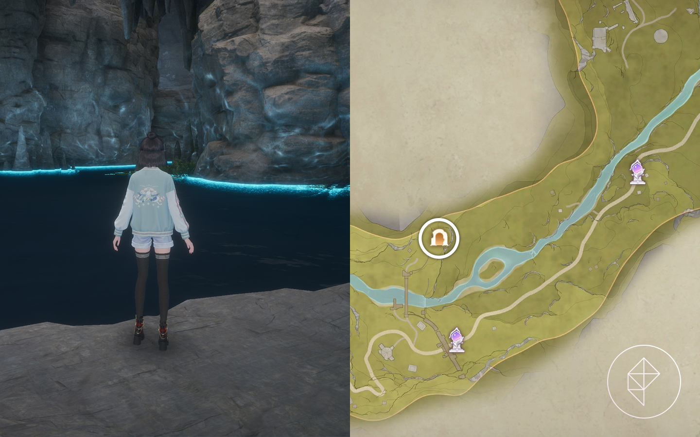 If you haven’t made it to the Abandoned Fanatic Wisher Camp, you’ll need to travel southwest in Breezy Meadow until you hit this skinny part of the map. The hidden cavern is north of the warp spire in the camp.
