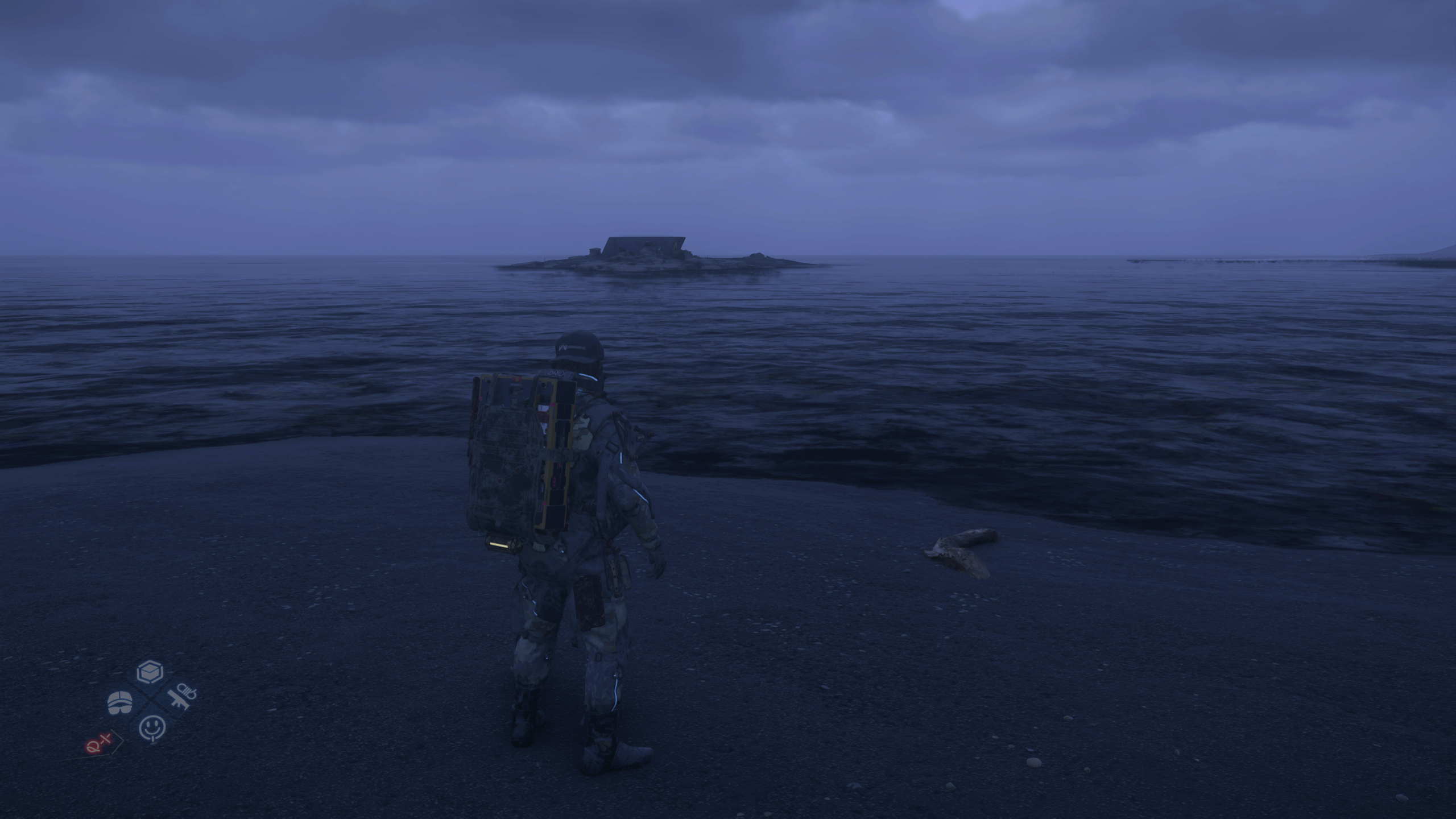 The easiest way to make it across is to walk through the tar ocean using your Odradek scanner to see what is safe to step on. The yellow circles mean that you are in shallow tar, whereas the red ones mean that you can’t safely cross that part. Multiple paths from the coastline are shallow enough for you to walk on, but be sure to continue to use your scanner with L1 to make sure you don’t accidentally walk off a safe path.