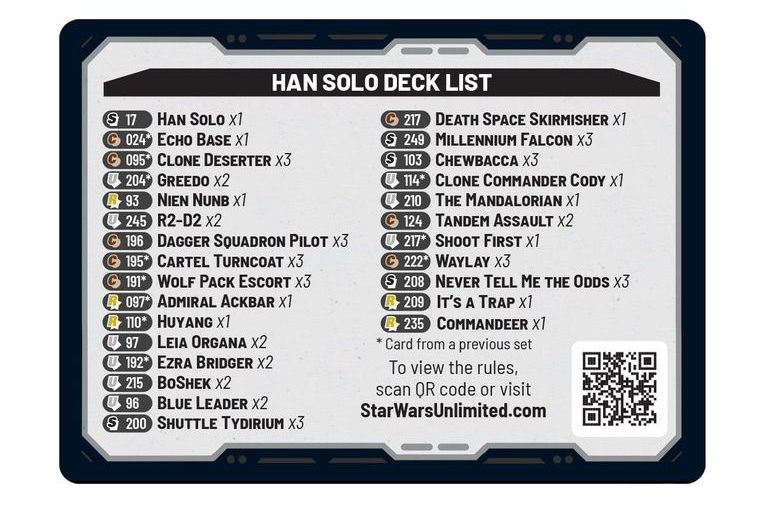 Unlike the two previous expansions, Jump to Lightspeed wont launch with a two-player starter box option, instead opting for a pair of premade decks built around Han Solo and Boba Fett. Jump to Lightspeed Spotlight Decks can only currently be pre-ordered as a pair from Miniature Market for $34.99. Both of the 50-card decks include tokens, a rulebook, and a single Jump to Lightspeed Booster Pack to jumpstart your collection.