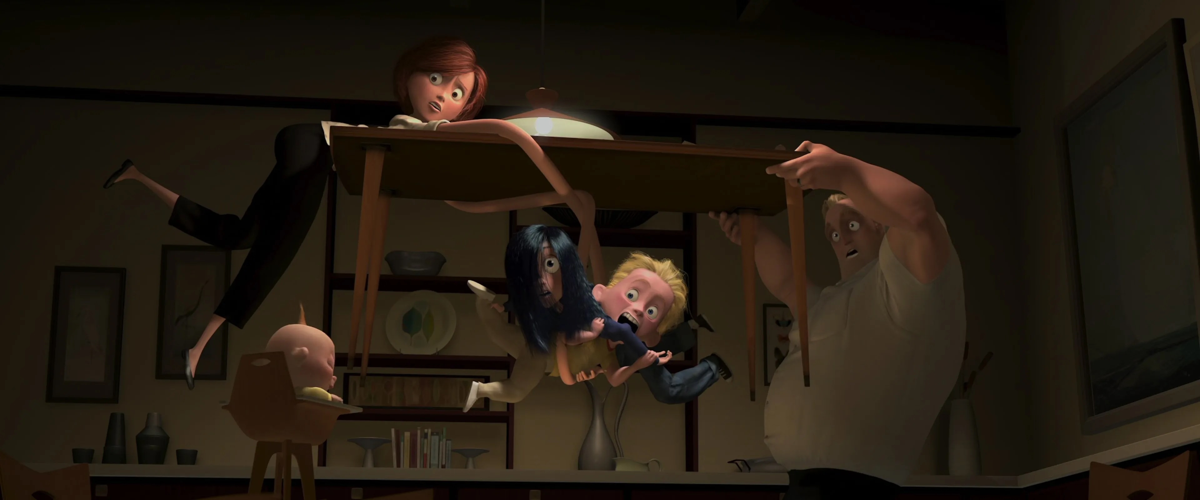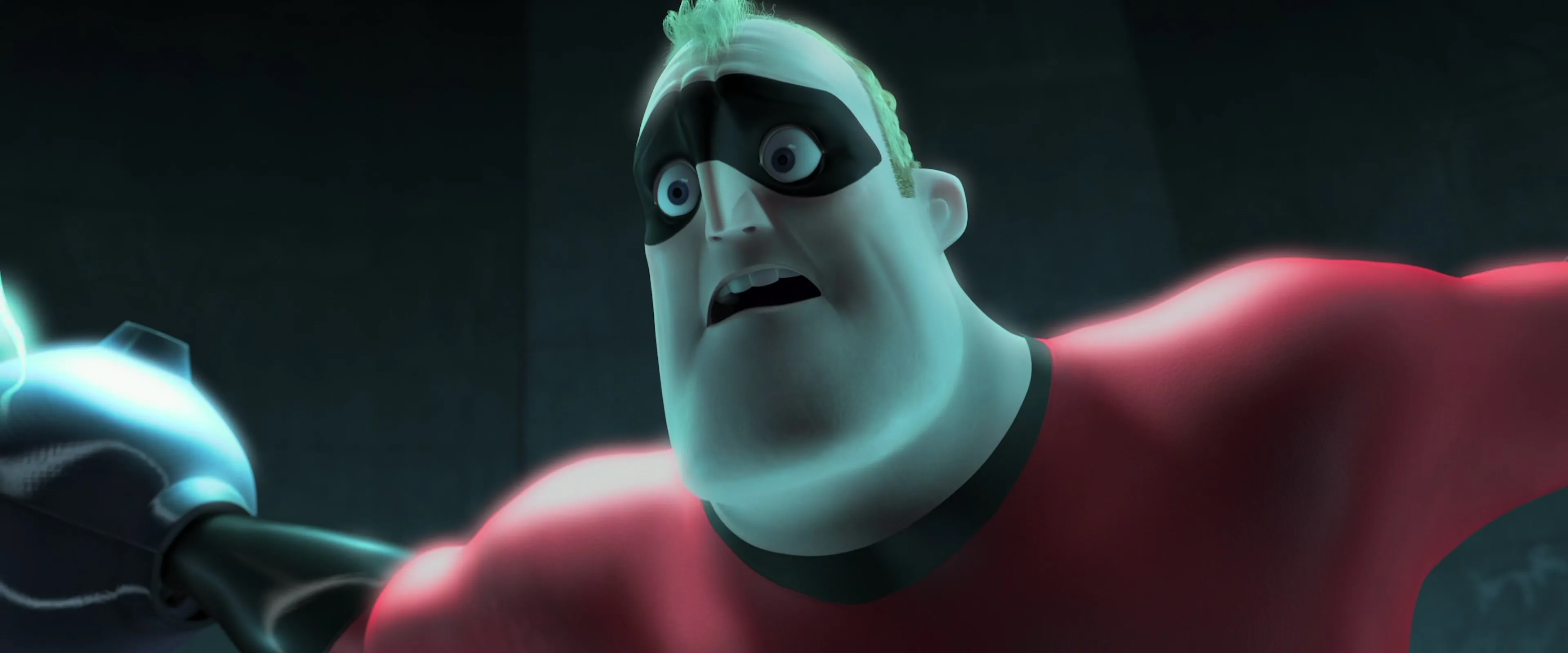 One of the reasons this movie flows so well is because Bird doesn’t back-burner any of his central foursome of heroes. There’s no “Superman and his supporting cast of far lesser heroes and ordinary humans” here, or “Brilliant scientific innovator and genius Reed Richards, plus his wife, brother-in-law, and friend.” The Incredibles gives a real sense that Bob, Helen, Violet, and Dash are all distinctive people, each with their own small, personal challenges and frustrations. When their desires inevitably come into conflict, there isn’t a clear and obvious Protagonist Who’s Right. Bob is justified in being miserable about spending his days using bureaucracy to deny insurees the settlements they deserve. Helen is justified in expecting him to commit and be present as a father and husband, instead of secretly gallivanting around the world while she raises their kids. Those kids are justified in their own frustrations, and less so in the ways they turn their unhappiness on their fellow family members.