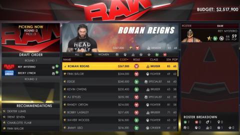 For 15 to 50 weeks, you can run Raw, Smackdown, NXT (pre-2.0), or NXT UK. I went with the original black and gold NXT brand and chose to go head-to-head with the Stephanie McMahon-led Monday Night Raw. My first order of business was drafting my superstars. The initial draft runs for eight rounds, though you can continue signing more wrestlers if you have the budget (otherwise, you can save your money for other things). Created superstars can also be uploaded as part of the draft pool.