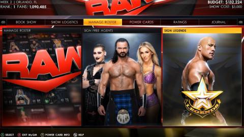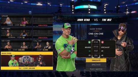 Building my dream team was a lot of fun, namely because of the strategy that goes into it. Every superstar has ratings for stamina (how often they can perform before getting injured) and popularity, their in-ring style, as well as their current face/heel alignment. It’s not enough to just sign big, expensive names. Having a balanced roster of heroes and villains along with a healthy variety in wrestling styles is key. After all, styles make the match-ups. For example, Giants work well with Cruiserweights, and Specialists can go with anyone. I like that this incentivized me to avoid only signing my personal favorites since several of them had similar or clashing styles. I also found it wise to invest in cheaper, lesser-known talents and build them into the next Cena or Rock. Don’t sweat trying to nab everyone. Throughout the season, you can grow your roster by signing free agents as well as bringing in Legends on part-time deals.