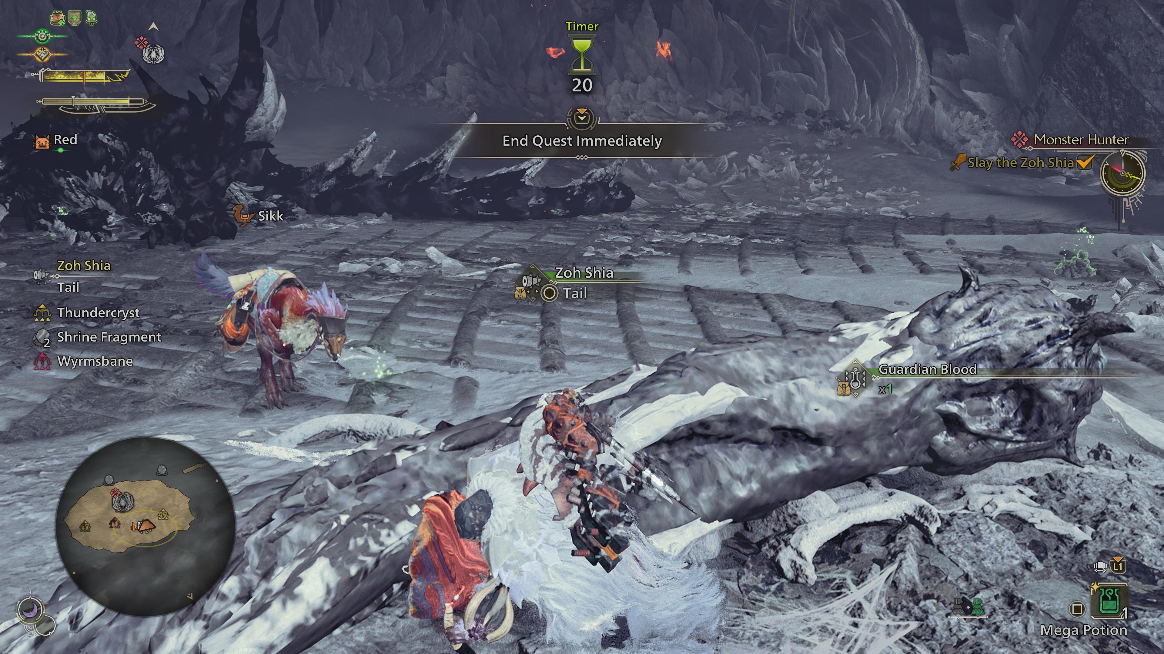 Zoh Shia is part of the main story of Monster Hunter Wilds. As such, its encounter is likely to fit your Hunter Rank at that corresponding moment. Since the encounter occurs during a main mission, you’ll be thrust into the fray after the introductory cutscene. As per usual, whenever you’re asked if you’re ready to depart, make sure that you’re carrying regular and mega potions with you. If you’re short on the latter, take a lap around the biome and loot any honey you come across.